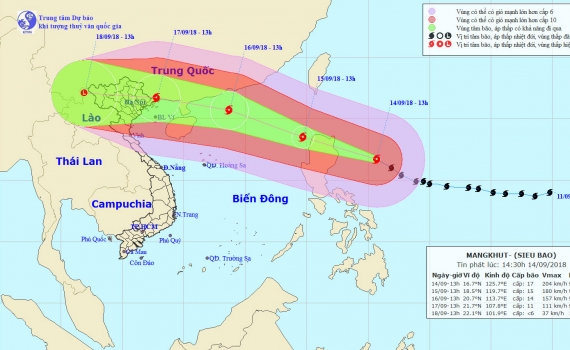 Hồi 13 giờ ngày 14/9, vị trí tâm siêu bão ở vào khoảng 16,7 độ Vĩ Bắc; 125,7 độ Kinh Đông, cách đảo Lu-Dông (Phi-líp-pin) khoảng 360km về phía Đông. Sức...