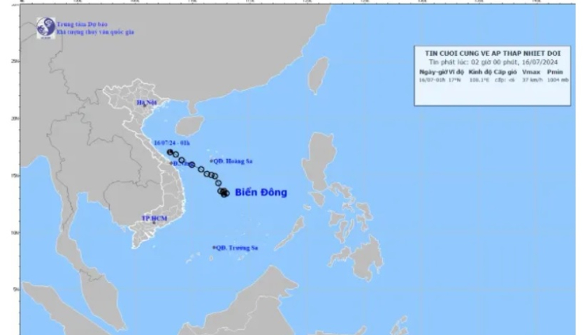 Sáng sớm nay (16/7), áp thấp nhiệt đới đã suy yếu thành một vùng áp thấp trên vùng biển Quảng Trị đến Đà Nẵng.