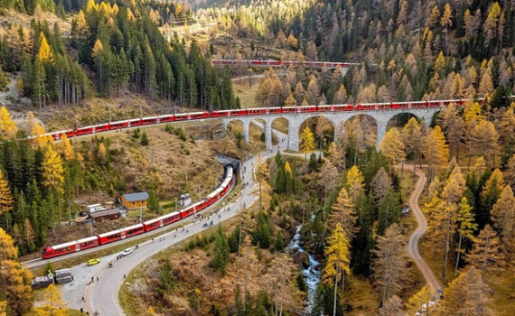 Đoàn tàu của công ty Rhaetian Railway (Thụy Sĩ) gồm 100 toa, dài 1,9 km, chạy trên một trong những tuyến đường sắt đẹp nhất thế giới.