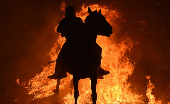Người dân làng cưỡi ngựa nhảy qua đống lửa đỏ rực, thực hiện nghi thức thanh tẩy nhằm cầu mong cho những chú ngựa được khỏe mạnh tại lễ hội Luminarias ở...