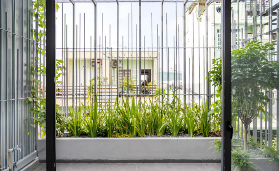 Lồng sắt làm chỗ cho cây leo, tạo nên lớp vỏ bảo vệ công trình khỏi tiếng ồn, bụi bặm và đưa con người lại gần thiên nhiên.