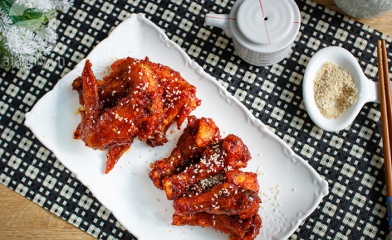 Chỉ mới nhìn qua món cánh gà rán cay kiểu Hàn Quốc đã rất hấp dẫn từ màu sắc và độ sệt sệt của lớp sốt