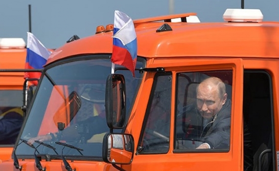 Tổng thống Nga dẫn đầu đoàn xe tải hạng nặng vượt qua cây cầu dài 19 km nối lãnh thổ Nga với bán đảo Crimea.
