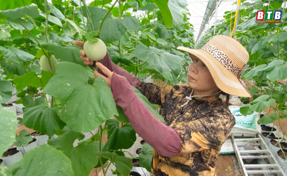 Mạnh dạn vay vốn, đầu tư sản xuất theo công nghệ của Israel đến nay mô hình trồng dưa trong nhà lưới của chị Trần Thị Nhàn, thôn Phú Vật, xã Tiến Đức...