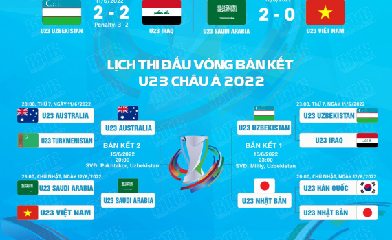 Sau lượt trận cuối cùng của vòng tứ kết U23 Châu Á ngày 12/6 đã xác định được 2 tấm vé cuối cùng vào vòng Bán kết U23 Châu á đó là U23 Nhật Bản Và U23...