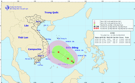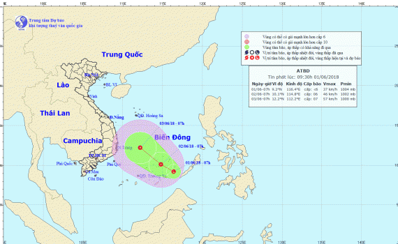 Hồi 13 giờ ngày 01/06, vị trí trung tâm vùng áp thấp ở vào khoảng 9,0-10,0 độ Vĩ Bắc; 115,5-116,5 độ Kinh Đông.