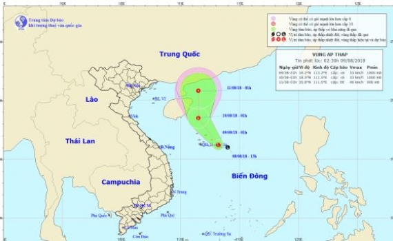 Hồi 01 giờ ngày 09/8, vị trí trung tâm vùng áp thấp ở vào khoảng 15,7-16,7 độ Vĩ Bắc; 112,7-113,7 độ Kinh Đông, ngay trên vùng biển phía Đông Nam quần đảo...