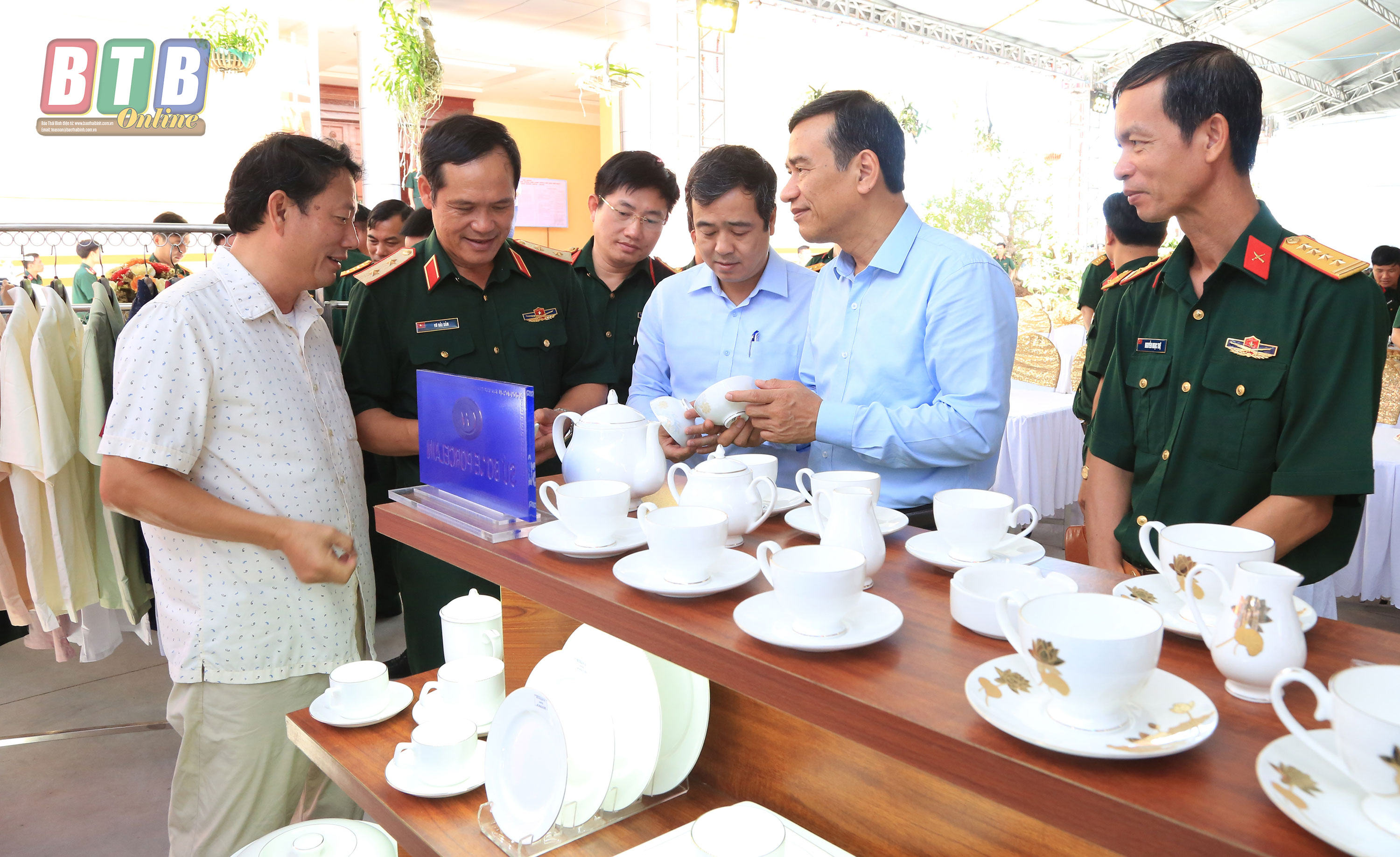 Các đồng chí lãnh đạo và các đại biểu tham quan sản phẩm của các đơn vị trưng bày tại hội nghị. Ảnh: Thành Tâm