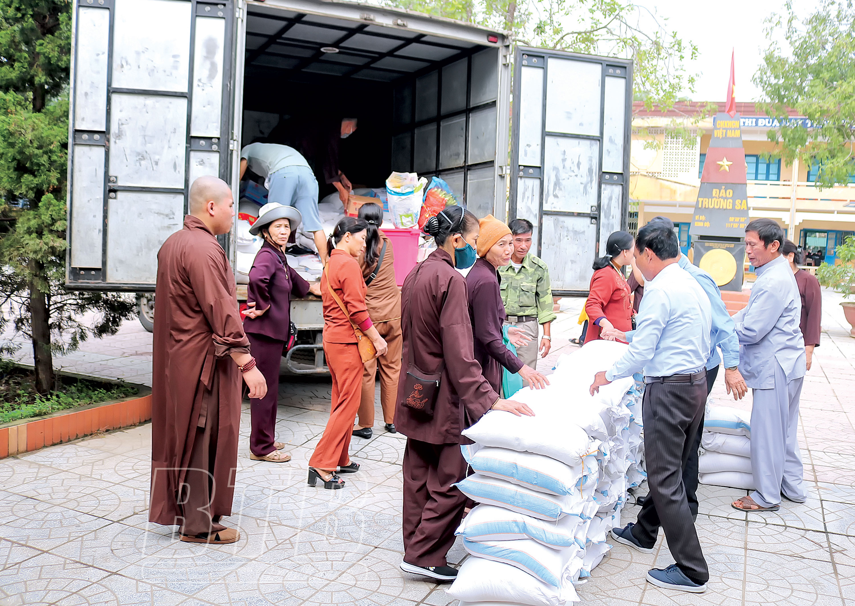 Tăng ni, Phật tử chùa Từ Xuyên chuyển gạo ủng hộ đến Trường THCS Thành Cổ, thị xã Quảng Trị.