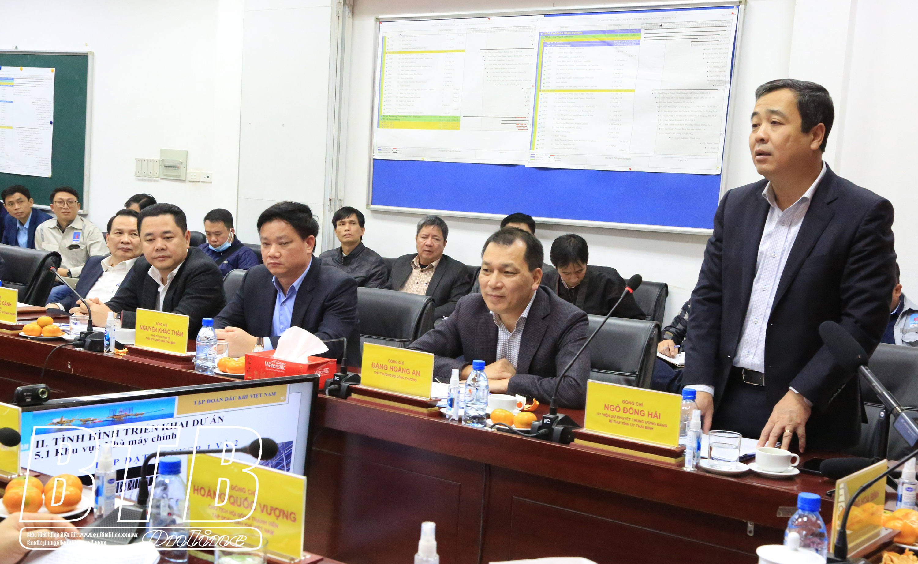 Báo cáo tại buổi làm việc, Trưởng ban Quản lý dự án Nhà máy nhiệt điện Thái Bình 2 Nguyễn Thành Hưởng cho biết: Chủ đầu tư của dự án là Tập đoàn Dầu khí quốc gia Việt Nam (PVN), tổng thầu EPC là Công ty Xây lắp dầu khí Việt Nam; quy mô công suất gồm 2 tổ máy 1.200 MW, điện năng sản xuất 7,2 tỷ kWh/năm, điều chỉnh lần 2 (sau VAT) lên 41.799 tỷ đồng. Dự kiến tiến độ hoàn thành nhà máy vào năm 2022 với điều kiện các vướng mắc về cơ chế được cấp có thẩm quyền tháo gỡ. Tiến độ tổng thể dự án đạt khoảng 86%, trong đó thiết kế đạt 99,8%, ký các hợp đồng mua sắm đạt 99,7%, gia công và chế tạo đạt hơn 94%, thi công đạt khoảng 84,1%, chạy thử khoảng 12,7%. Tuy nhiên, đến nay dự án đang bị đình trệ do vướng mắc về cơ chế và giải ngân nên các đơn vị và nhà thầu không có vốn để tiếp tục thực hiện dự án.