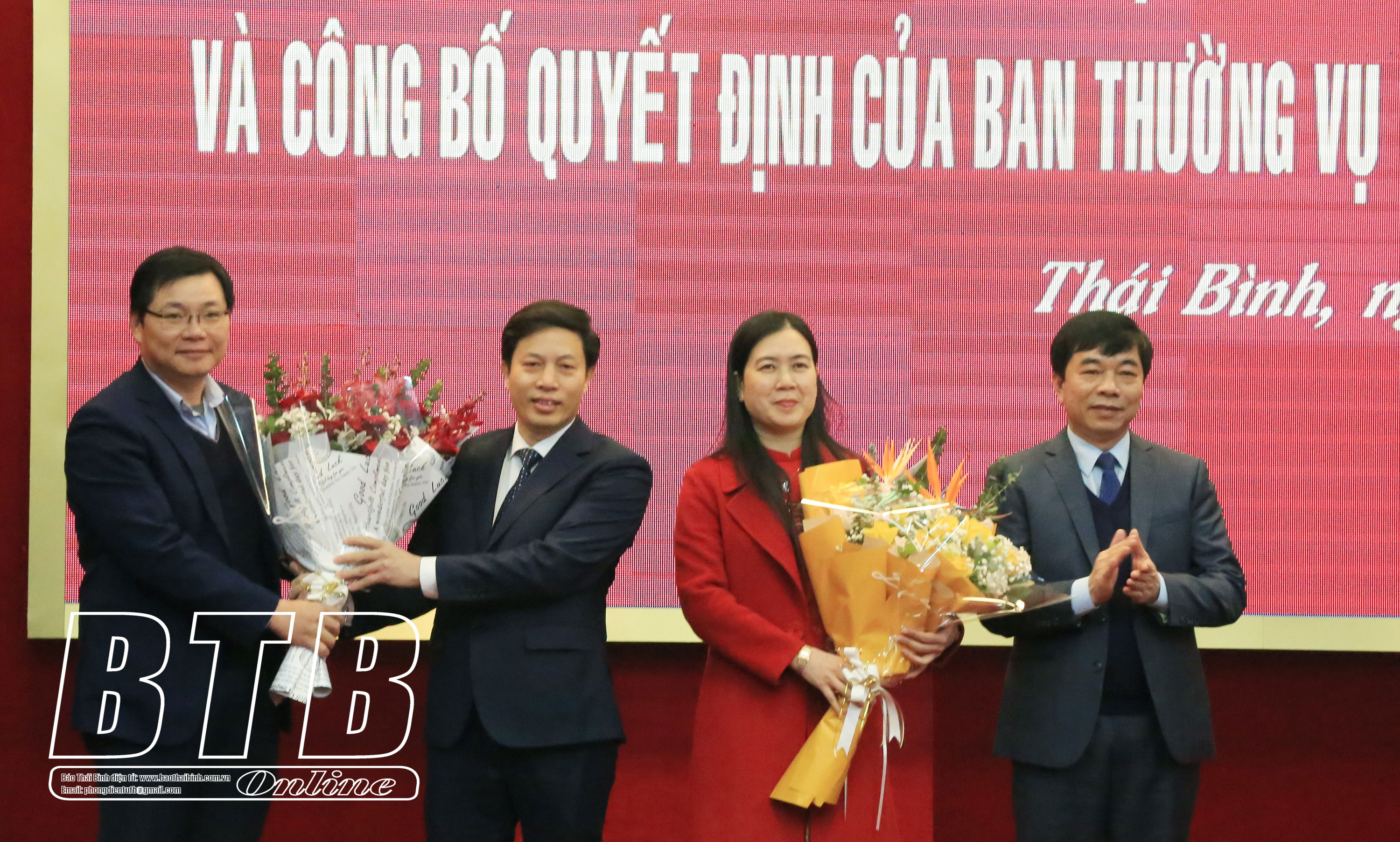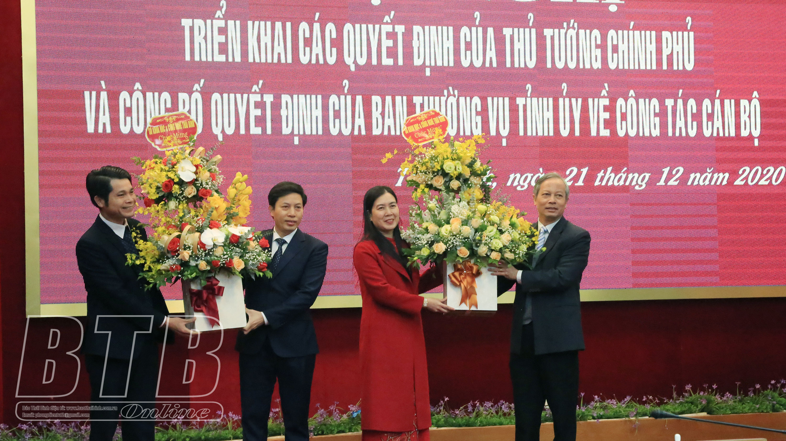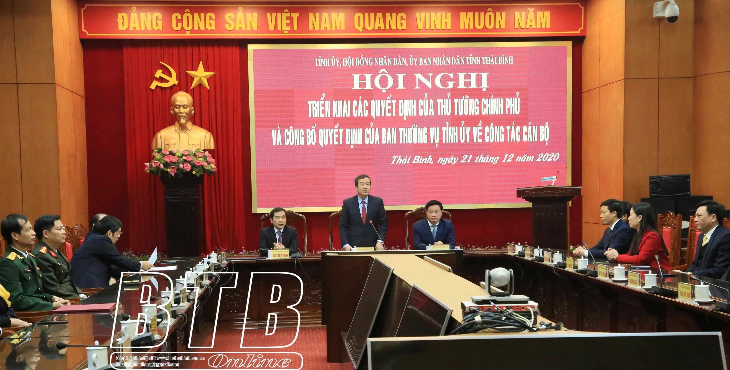 Tại hội nghị, đồng chí Nguyễn Quang Hưng, Ủy viên Ban Thường vụ Tỉnh ủy, Phó Chủ tịch thường trực UBND tỉnh công bố quyết định của Thủ tướng Chính phủ về việc phê chuẩn kết quả bầu bổ sung chức vụ Phó Chủ tịch UBND tỉnh, nhiệm kỳ 2016 - 2021 kể từ ngày 18/12/2020 đối với các đồng chí: Trần Thị Bích Hằng, Tỉnh ủy viên, Giám đốc Sở Khoa học và Công nghệ; Lại Văn Hoàn, Tỉnh ủy viên, Bí thư Huyện ủy Tiền Hải; lãnh đạo Ban Tổ chức Tỉnh ủy công bố quyết định của Ban Thường vụ Tỉnh ủy về việc điều động đồng chí Lại Văn Hoàn, Tỉnh ủy viên, Bí thư Huyện ủy Tiền Hải đến nhận công tác tại UBND tỉnh để giữ chức vụ Phó Chủ tịch UBND tỉnh kể từ ngày 23/12/2020.