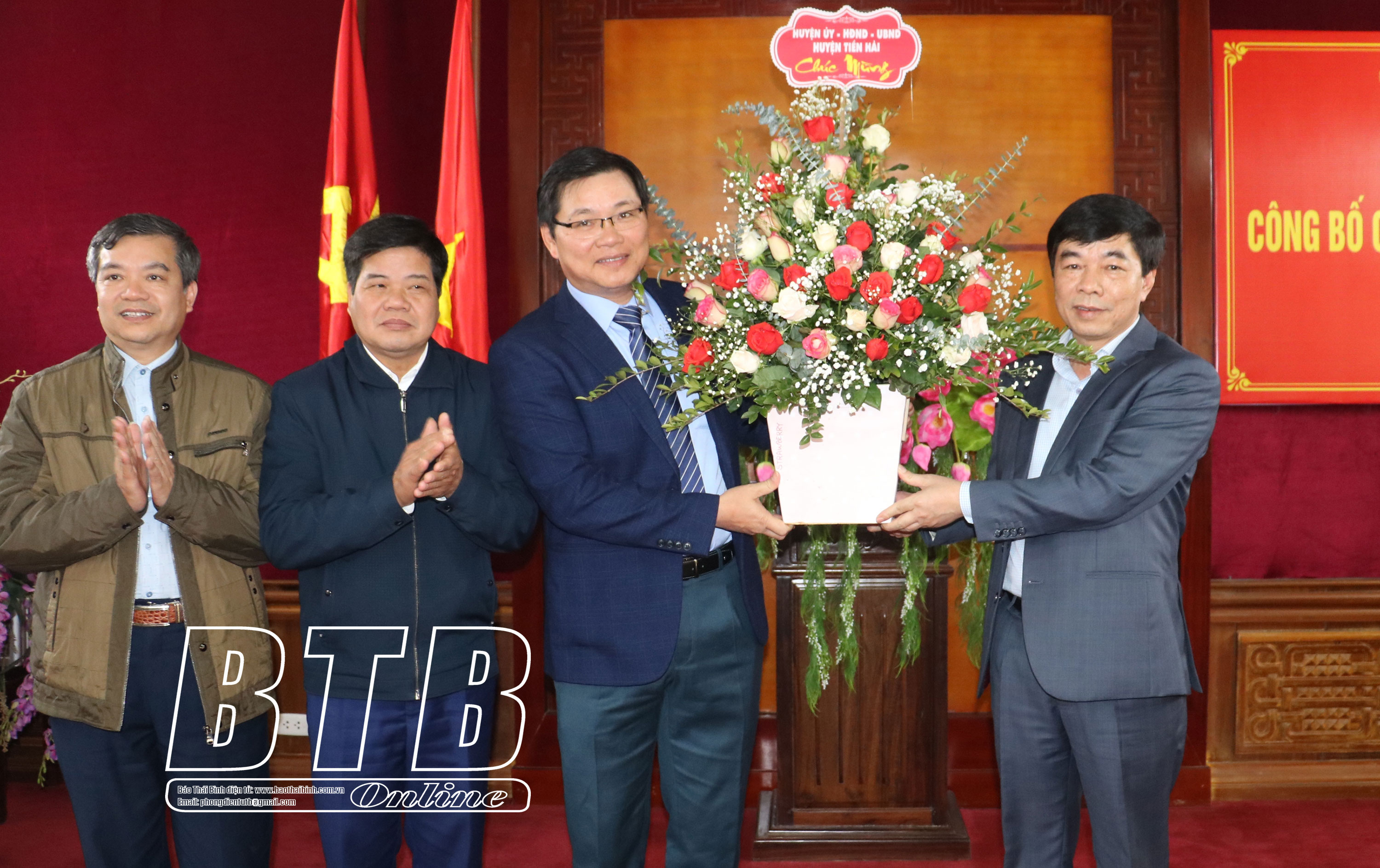 Lãnh đạo huyện Tiền Hải tặng hoa chúc mừng đồng chí Phạm Hồng Tùng.