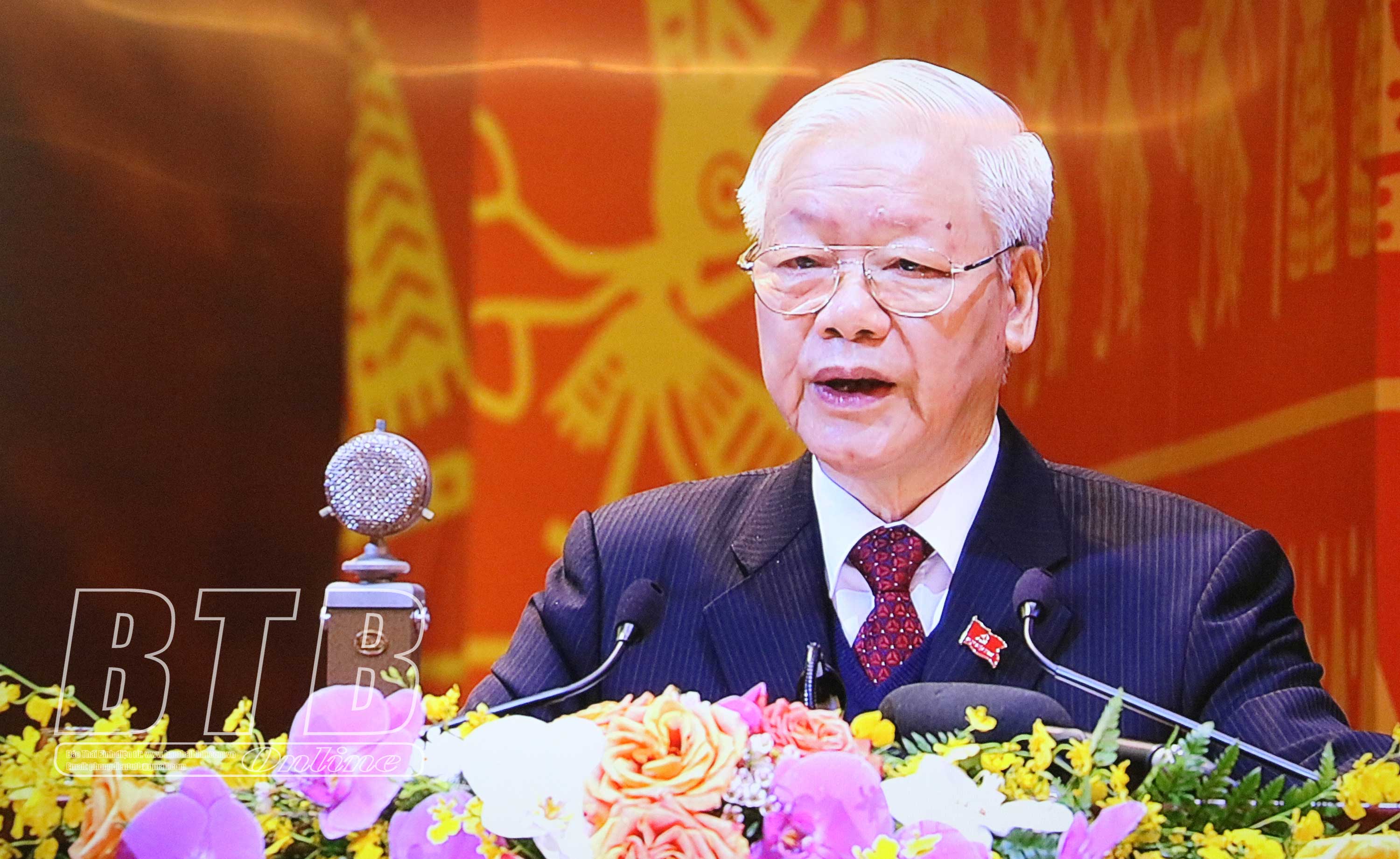 Tổng Bí thư, Chủ tịch nước Nguyễn Phú Trọng thay mặt Ban Chấp hành Trung ương khóa XII trình bày Báo cáo chính trị của Ban Chấp hành Trung ương Đảng khóa XII và các văn kiện trình Đại hội.