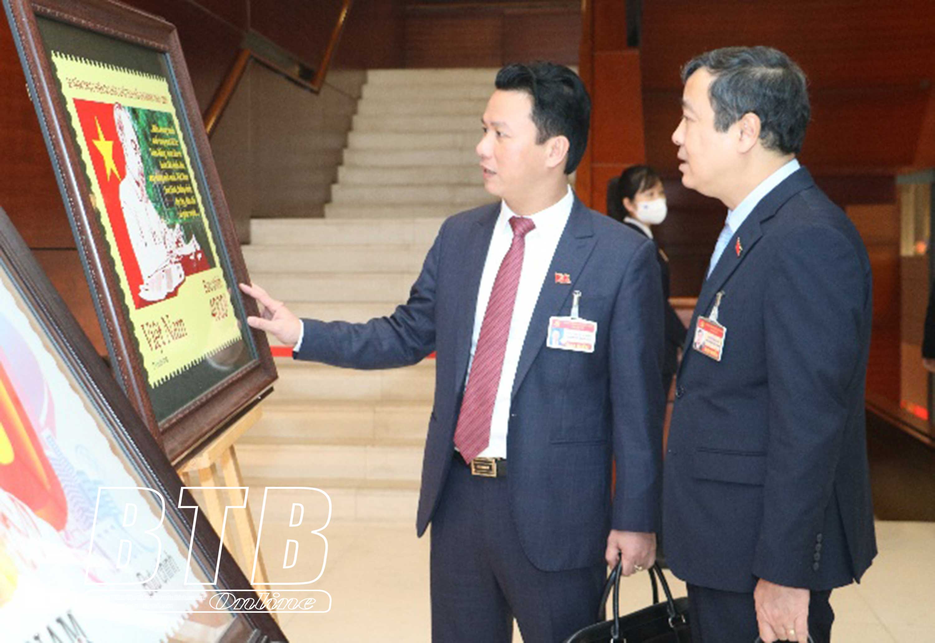 Đồng chí Ngô Đông Hải, Ủy viên dự khuyết Ban Chấp hành Trung ương Đảng, Bí thư Tỉnh ủy tham quan trưng bày bộ tem bưu chính chào mừng Đại hội XIII của Đảng tại Trung tâm Hội nghị quốc gia.