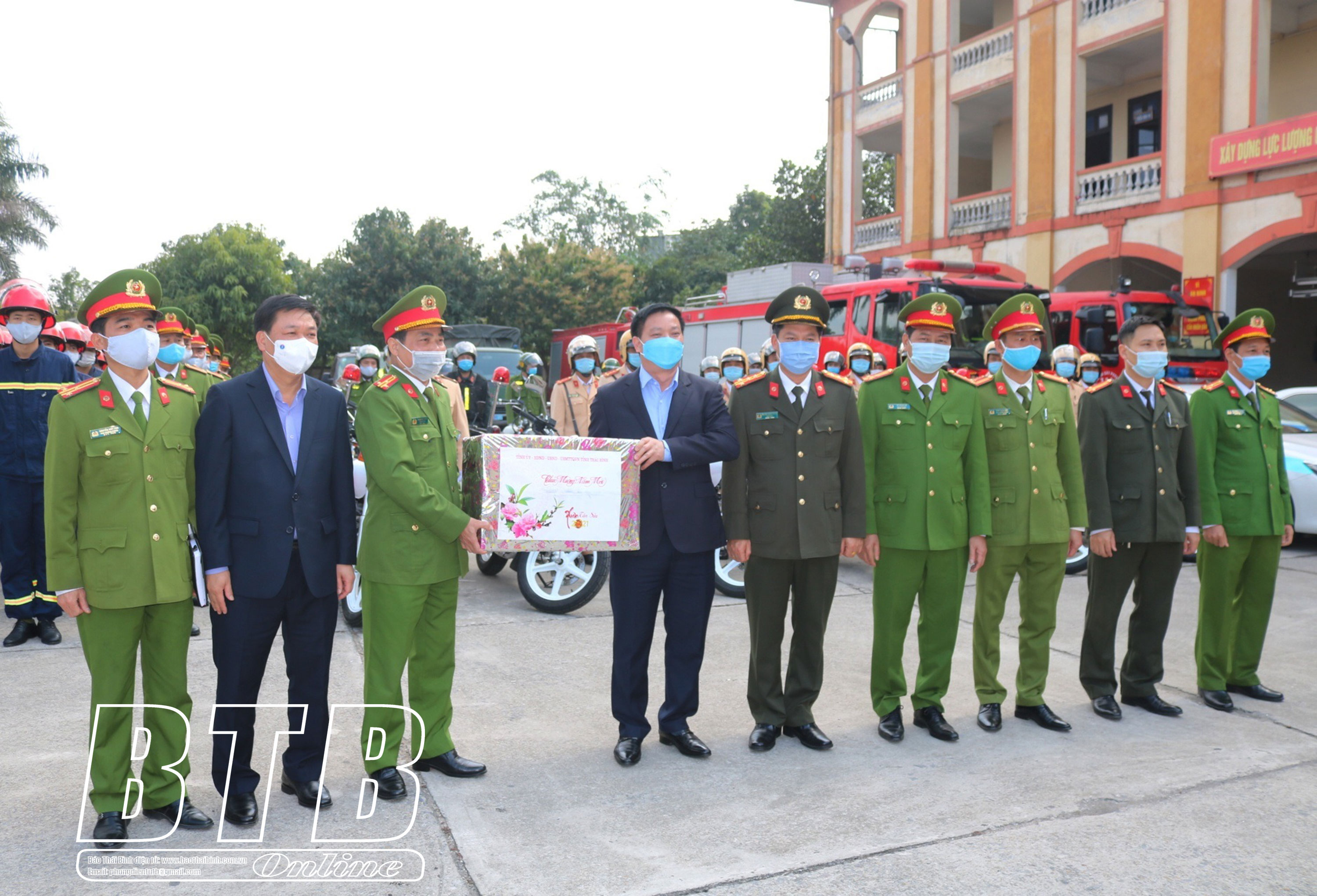 Đồng chí Nguyễn Khắc Thận, Phó Bí thư Tỉnh ủy, Chủ tịch UBND tỉnh tặng quà lực lượng Cảnh sát Giao thông, Cảnh sát Phòng cháy chữa cháy và cứu hộ cứu nạn - Công an tỉnh.