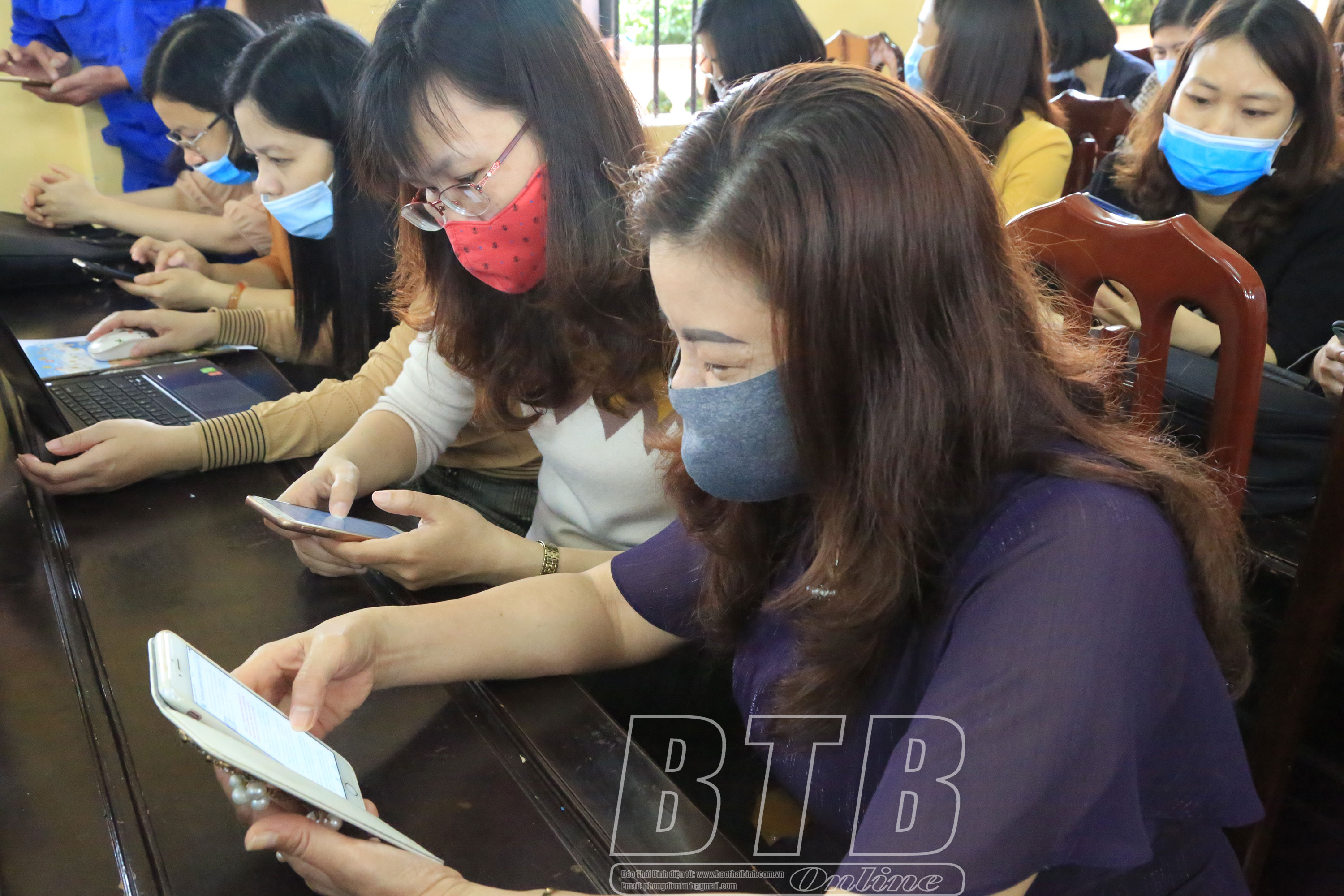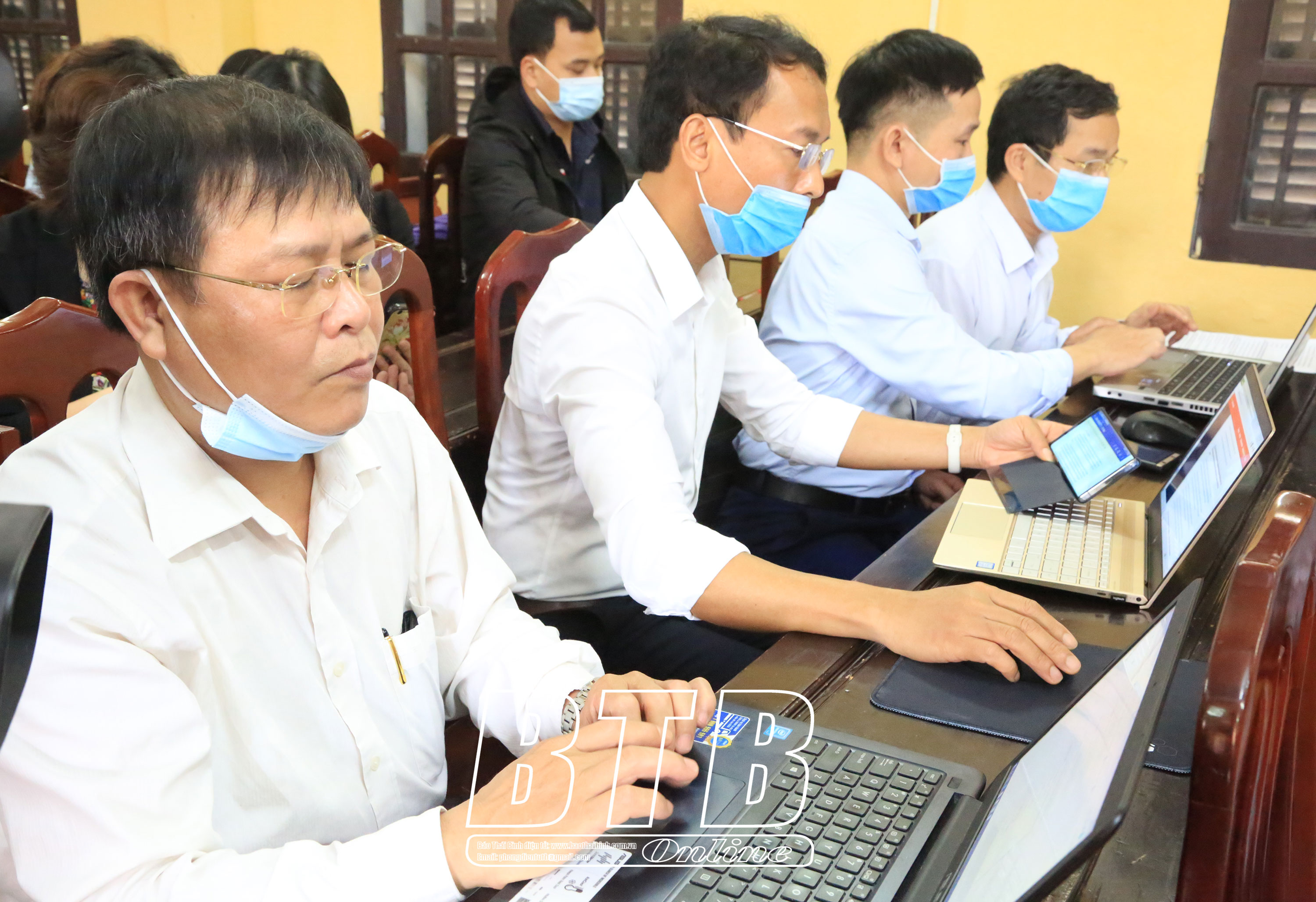Nhân viên VNPT hỗ trợ thầy cô giáo Trường THPT Nguyễn Trãi (Vũ Thư ) tham gia cuộc thi. Ảnh: Thành Tâm
