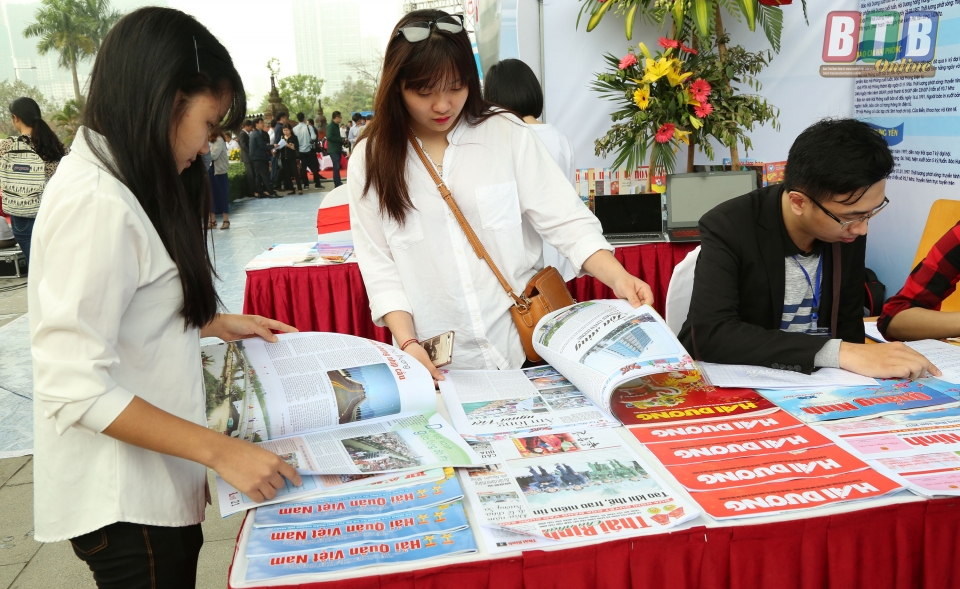 Bạn đọc xem ấn phẩm Báo Thái Bình trưng bày tại Hội Báo Xuân 2018. Ảnh: Thành Tâm