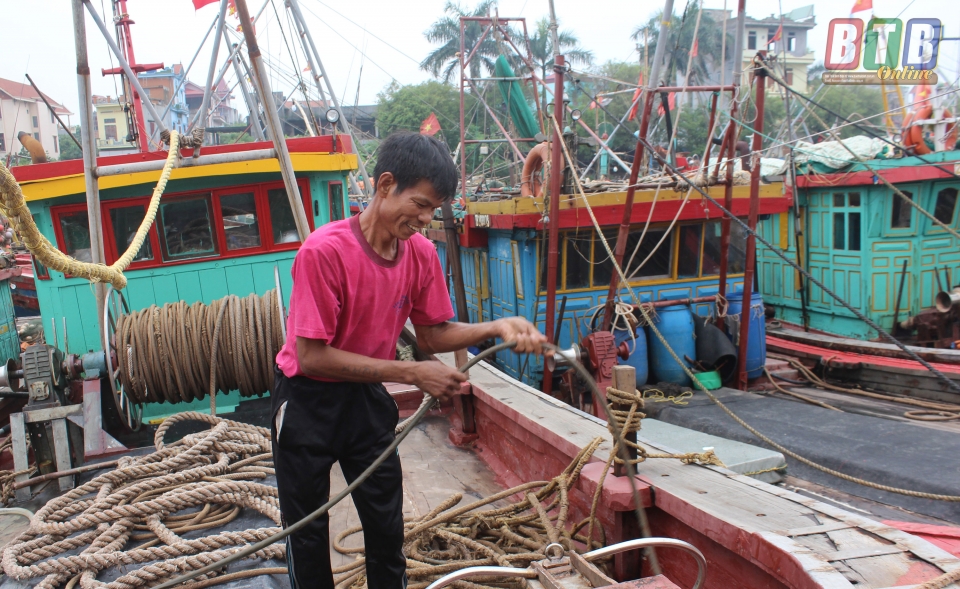 Sáng sớm ngày 18/7, tại bến cá Tân Sơn các chủ tàu thuyền đang tích cực cho tàu vào khu neo đậu. Anh Nguyễn Văn Nam, khu 9, thị trấn Diêm Điền cho biết: ngay sau khi nhận được tin báo về cơn bão số 3 của Đồn Biên phòng Cửa khẩu cảng Diêm Điền, tôi đã cùng anh em thuyền viên di chuyển tàu quay về cảng cá Tân Sơn để tránh trú bão. Hiện tại, anh em đang chằng bọc dây neo, thu gọn vật dụng trên tàu.
