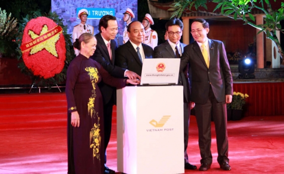 Thủ tướng Chính phủ Nguyễn Xuân Phúc và các đại biểu bấm nút khai trương Cổng thông tin điện tử về liệt sĩ, mộ liệt sĩ và nghĩa trang liệt sĩ.