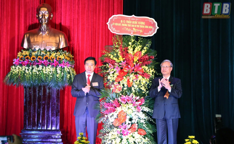 Đồng chí Trần Quốc Vượng, Ủy viên Bộ Chính trị, Thường trực Ban Bí thư tặng hoa chúc mừng.