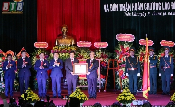 Đồng chí Trần Quốc Vượng, Ủy viên Bộ Chính trị, Thường trực Ban Bí thư trao Huân chương Lao động hạng Nhất cho huyện Tiền Hải tại lễ kỷ niệm.