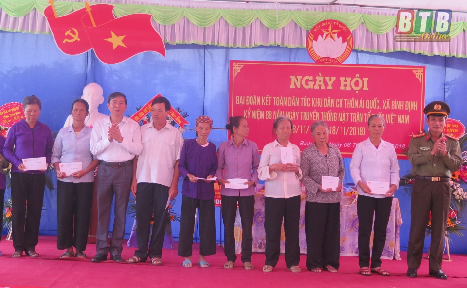 Thay mặt Tỉnh ủy, HĐND, UBND tỉnh, Ủy ban MTTQ tỉnh, đồng chí Đặng Trọng Thăng, Phó Bí thư Tỉnh ủy, Chủ tịch UBND tỉnh đã trao tặng 10 triệu đồng cho thôn Ái Quốc và hỗ trợ 40 triệu đồng cho 1 hộ gia đình có hoàn cảnh khó khăn xây nhà đại đoàn kết.