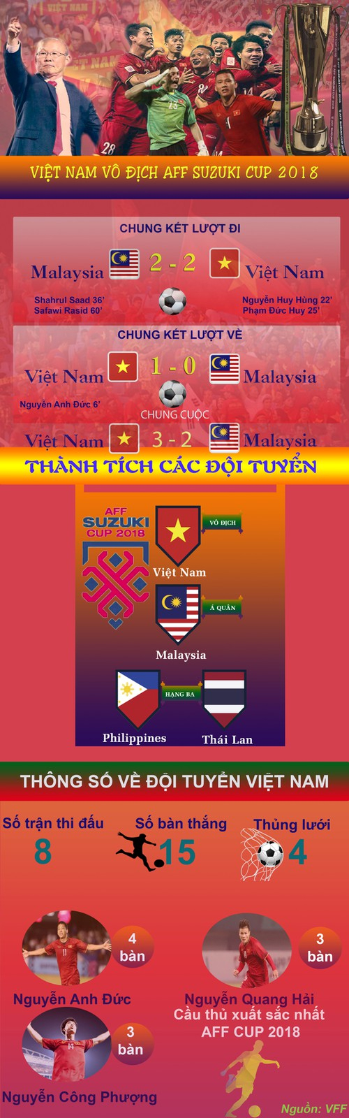 Xuất sắc đánh bại Malaysia với tổng tỷ số 3-2 sau hai lượt trận ở chung kết, đội tuyển Việt Nam đã lên ngôi vô địch AFF Cup 2018 với thành tích bất bại.