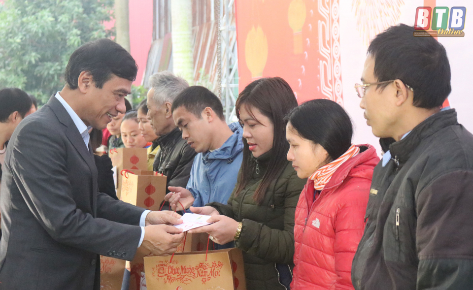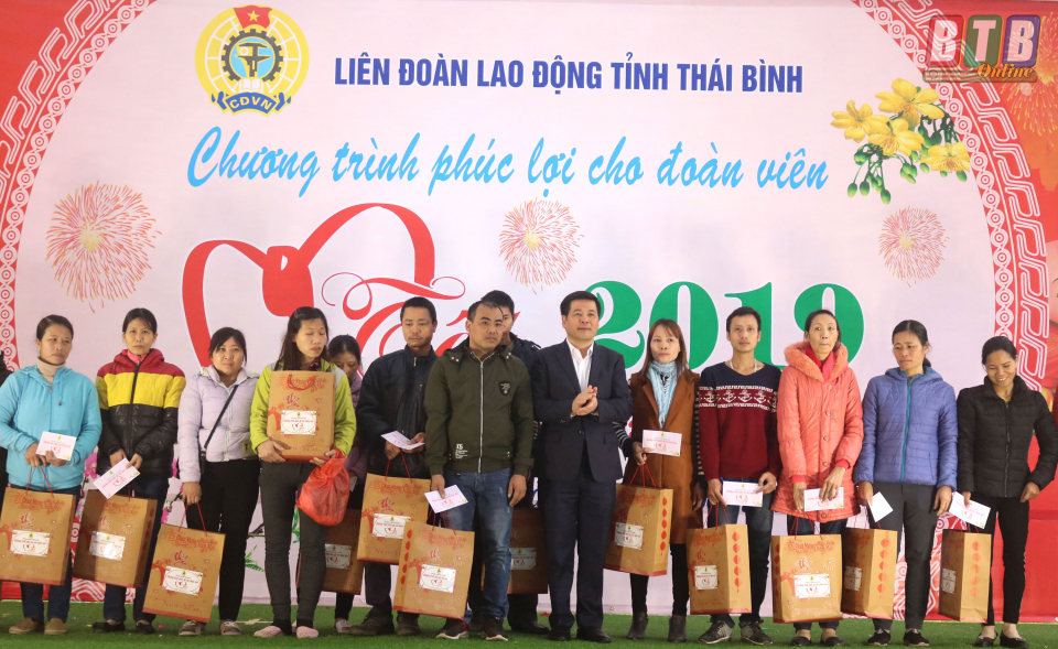 Tại chương trình, các đồng chí lãnh đạo tỉnh, lãnh đạo một số sở ngành cùng các doanh nghiệp đã trao quà tết cho 230 công nhân lao động có hoàn cảnh khó khăn, trong đó có 200 suất của Liên đoàn Lao động tỉnh, mỗi suất trị giá 482 nghìn đồng; 30 suất của Công ty Cổ phần Tập đoàn ThaiBinhSeed, mỗi suất 300 nghìn đồng và 5kg gạo.