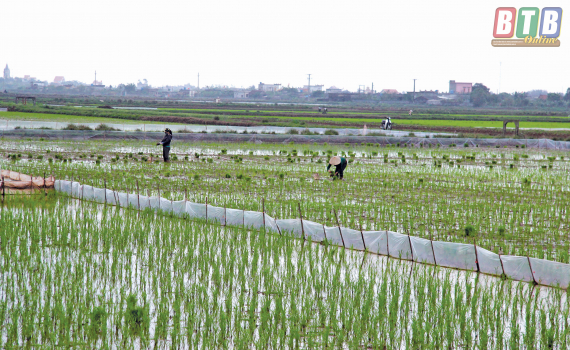 Nông dân huyện Tiền Hải tập trung ra đồng chăm sóc lúa xuân.