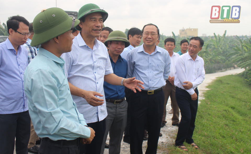 Đồng chí Đặng Trọng Thăng, Phó Bí thư Tỉnh ủy, Chủ tịch UBND tỉnh và lãnh đạo Công ty Cổ phần T&T 159 khảo sát thực địa tại xã Quỳnh Giao (Quỳnh Phụ).