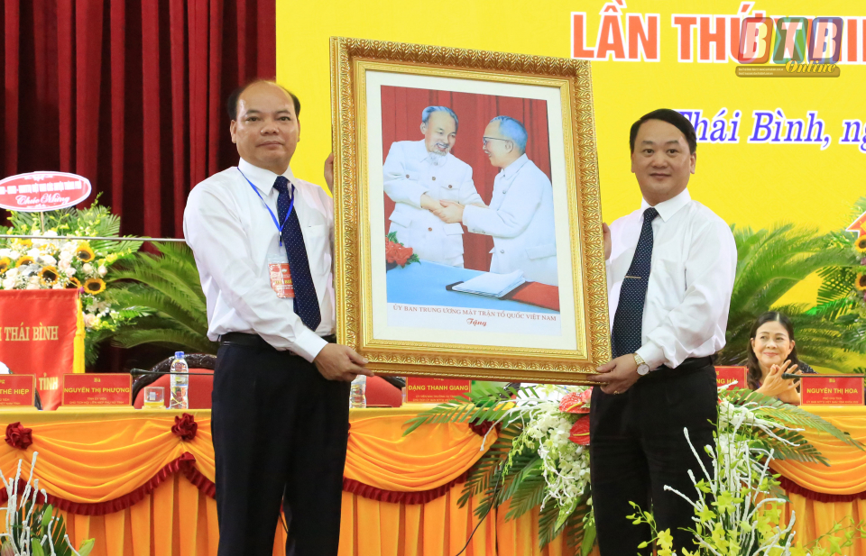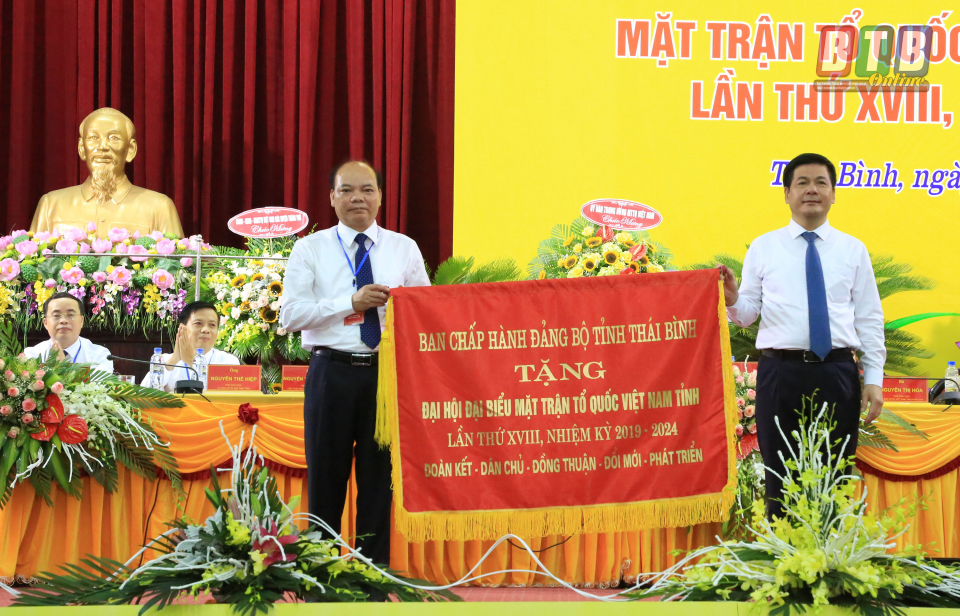 Thay mặt Tỉnh ủy, HĐND, UBND tỉnh, đồng chí Nguyễn Hồng Diên, Ủy viên Trung ương Đảng, Bí thư Tỉnh ủy, Chủ tịch HĐND tỉnh tặng bức trướng mang dòng chữ “Đoàn kết, dân chủ, đồng thuận, đổi mới, phát triển” cho Đại hội.