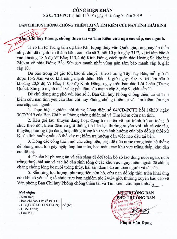 Ngày 31/7, Ban Chỉ huy Phòng, chống thiên tai và Tìm kiếm cứu nạn tỉnh Thái Bình có Công điện khẩn số 05/CĐ-PCTT gửi Ban chỉ huy phòng, chống thiên tai và tìm kiếm cứu nạn các cấp, các ngành.