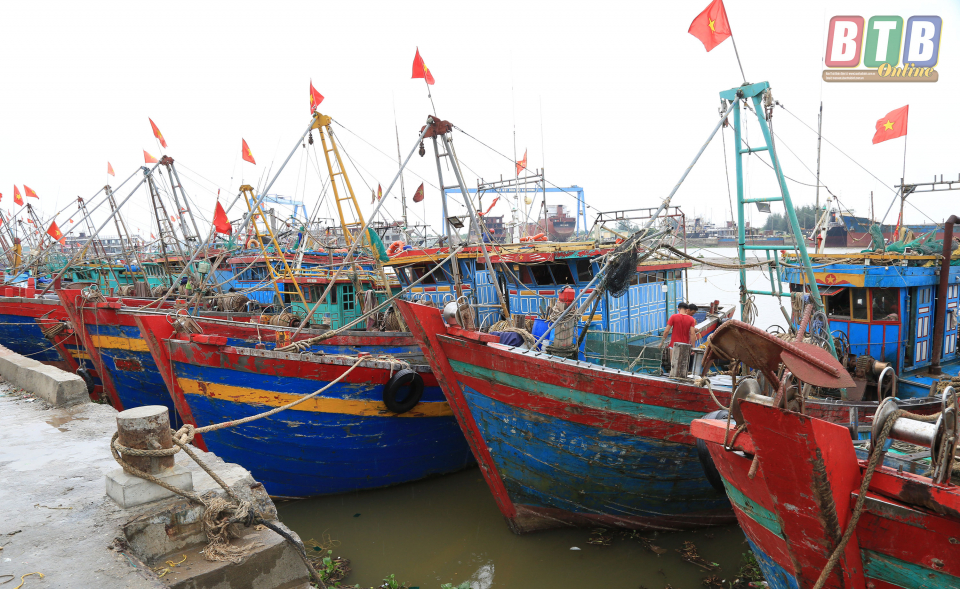 Tàu thuyền của ngư dân Thái Thụy neo đậu tránh trú bão tại cảng cá Tân Sơn, huyện Thái Thụy.