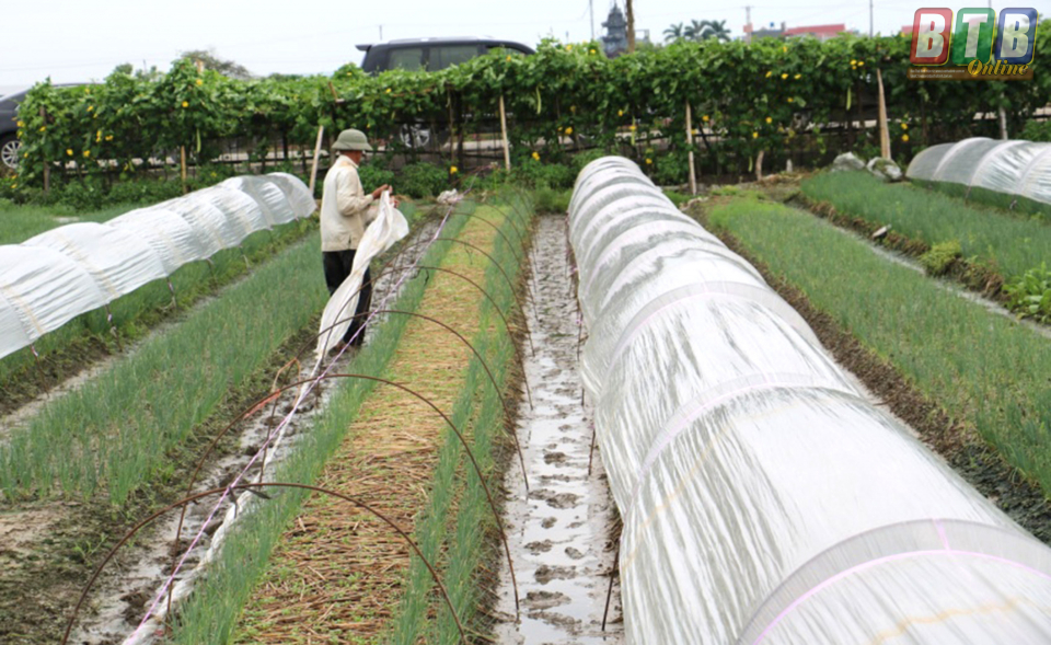 Nông dân xã Quỳnh Hải (Quỳnh Phụ) bảo vệ hoa màu trước khi bão đổ bộ vào đất liền.
