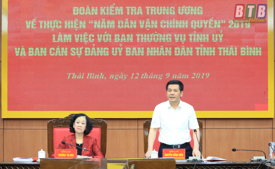 Kết luận buổi làm việc, đồng chí Trương Thị Mai, Ủy viên Bộ Chính trị, Bí thư Trung ương Đảng, Trưởng ban Dân vận Trung ương, Trưởng đoàn kiểm tra ghi nhận, đánh giá cao kết quả trong phát triển kinh tế - xã hội mà Đảng bộ, chính quyền và nhân dân tỉnh Thái Bình đã đạt được thời gian qua, đặc biệt là kết quả trong xây dựng nông thôn mới.