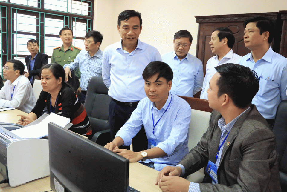 Đồng chí Đặng Trọng Thăng, Phó Bí thư Tỉnh ủy, Chủ tịch UBND tỉnh kiểm tra công tác thực hiện giải quyết TTHC theo phương án "5 tại chỗ" tại bộ phận tiếp nhận và trả kết quả của huyện Đông Hưng. Ảnh: Thành Tâm