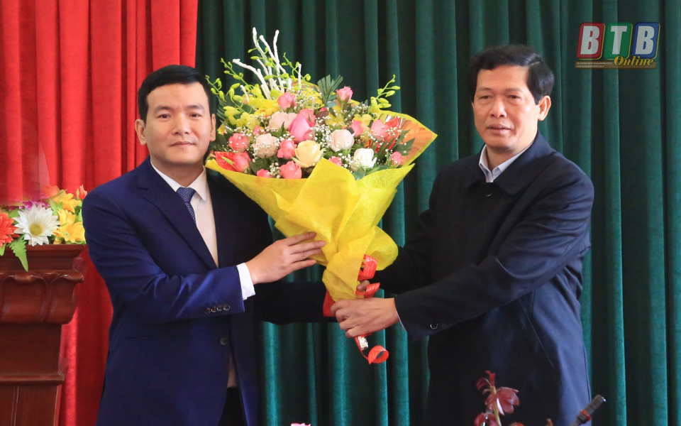 Đồng chí Nguyễn Hông Chuyên, Ủy viên Ban Thường vụ, Trưởng ban Tuyên giáo Tỉnh ủy tặng hoa chúc mừng đồng chí Trần Quang Triển. Ảnh: Thành Tâm