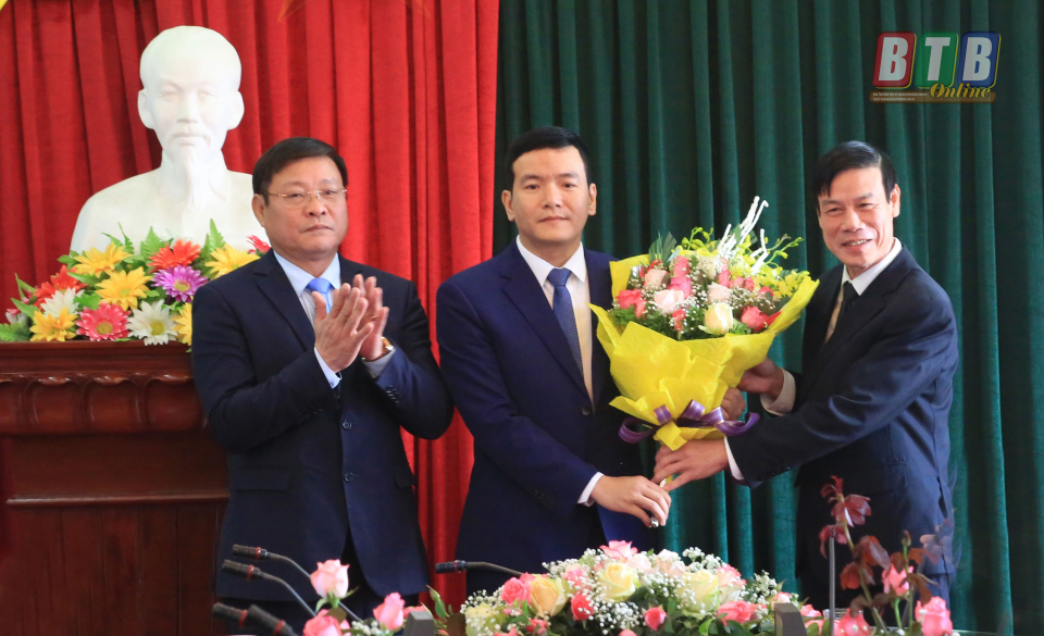 Đồng chí Ngô Đông Hải, Ủy viên dự khuyết Trung ương Đảng, Phó Bí thư thường trực Tỉnh uỷ trao quyết định, tặng hoa đồng chí Trần Quang Triển. Ảnh:Thành Tâm