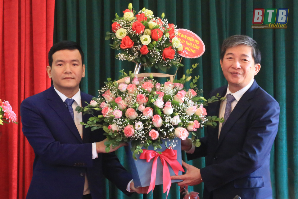 Đồng chí Hà Công Toàn, Ủy viên Ban Thường vụ, Chủ nhiệm Ủy ban Kiểm tra Tỉnh ủy tặng hoa chúc mừng đồng chí Trần Quang Triển. Ảnh: Thành Tâm