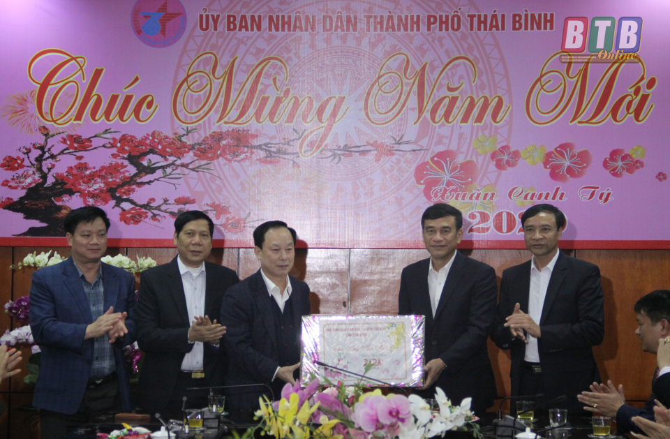 Đồng chí Đặng Trọng Thăng, Phó Bí thư Tỉnh ủy, Chủ tịch UBND tỉnh tặng quà lãnh đạo UBND thành phố Thái Bình.