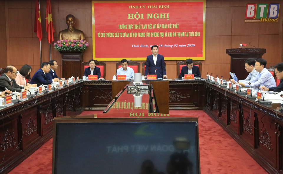 Thay mặt Tỉnh ủy, HĐND, UBND tỉnh, đồng chí Nguyễn Hồng Diên, Ủy viên Trung ương Đảng, Bí thư Tỉnh ủy, Chủ tịch HĐND tỉnh giới thiệu khái quát với thành viên của Tập đoàn Việt Phát về những tiềm năng, thế mạnh, chủ trương thu hút đầu tư của Thái Bình những năm gần đây. Hiện nay, Thái Bình đang triển khai nhiều dự án giao thông kết nối với các tỉnh đồng bằng duyên hải Bắc Bộ, nhất là tuyến đường bộ ven biển, Khu kinh tế Thái Bình là cơ hội để các doanh nghiệp đến nghiên cứu, đầu tư vào địa bàn. Đặc biệt, thành phố Thái Bình đang thực hiện lộ trình để trở thành đô thị loại I. Vì vậy, đề xuất nghiên cứu của Tập đoàn Việt Phát đầu tư xây dựng trung tâm thương mại kết hợp khu đô thị tại thành phố Thái Bình sẽ góp phần để thành phố hoàn thiện các tiêu chí của đô thị loại I, rất phù hợp với chủ trương đầu tư và định hướng phát triển của tỉnh.