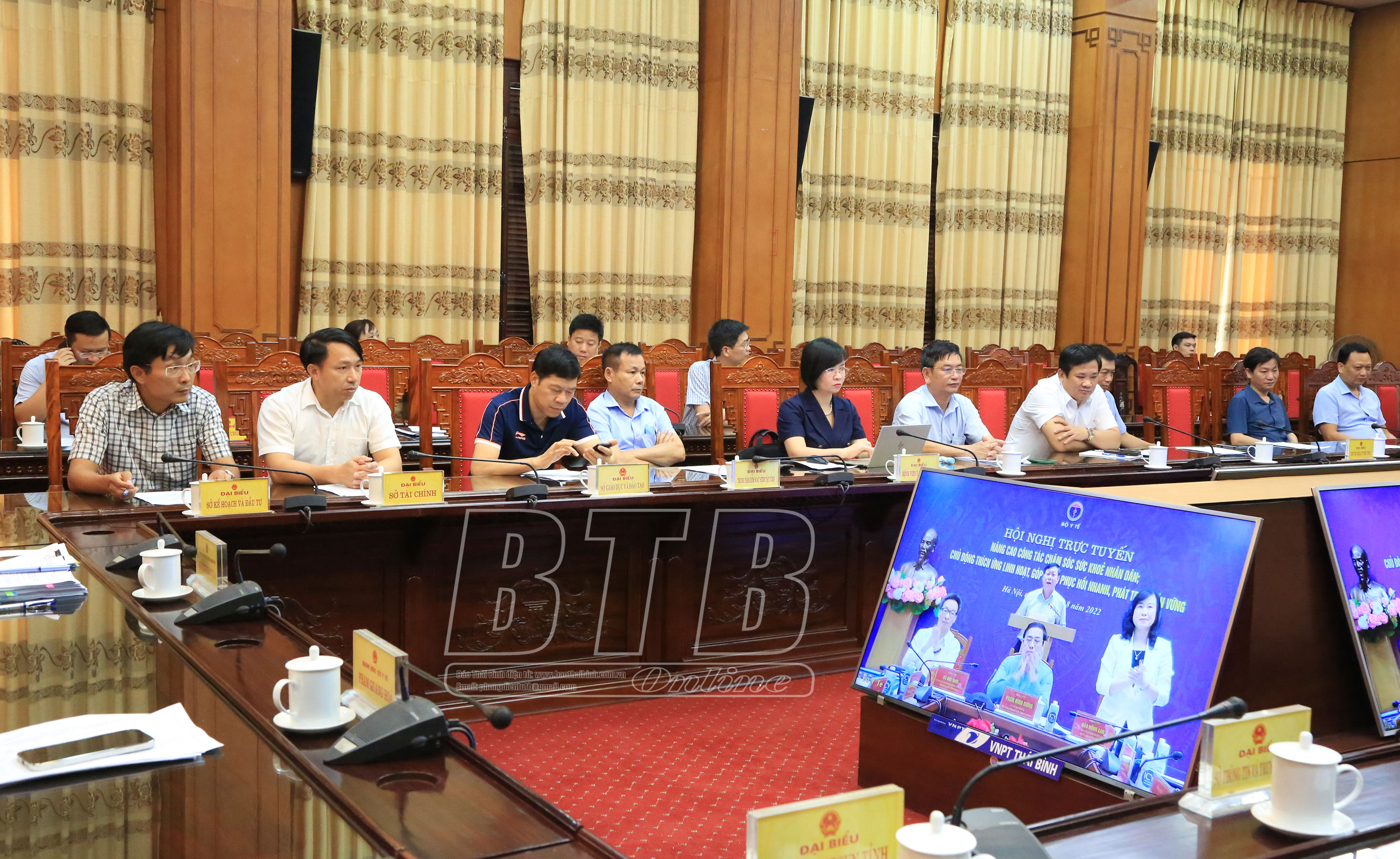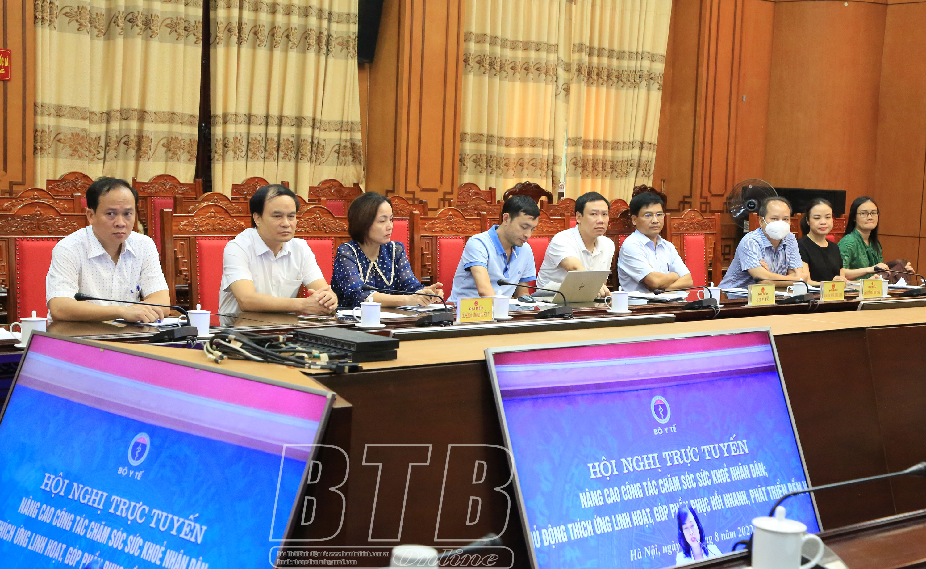 Đồng chí Nguyễn Khắc Thận, Phó Bí thư Tỉnh ủy, Chủ tịch UBND tỉnh và lãnh đạo Sở Y tế dự hội nghị tại điểm cầu tỉnh Thái Bình.