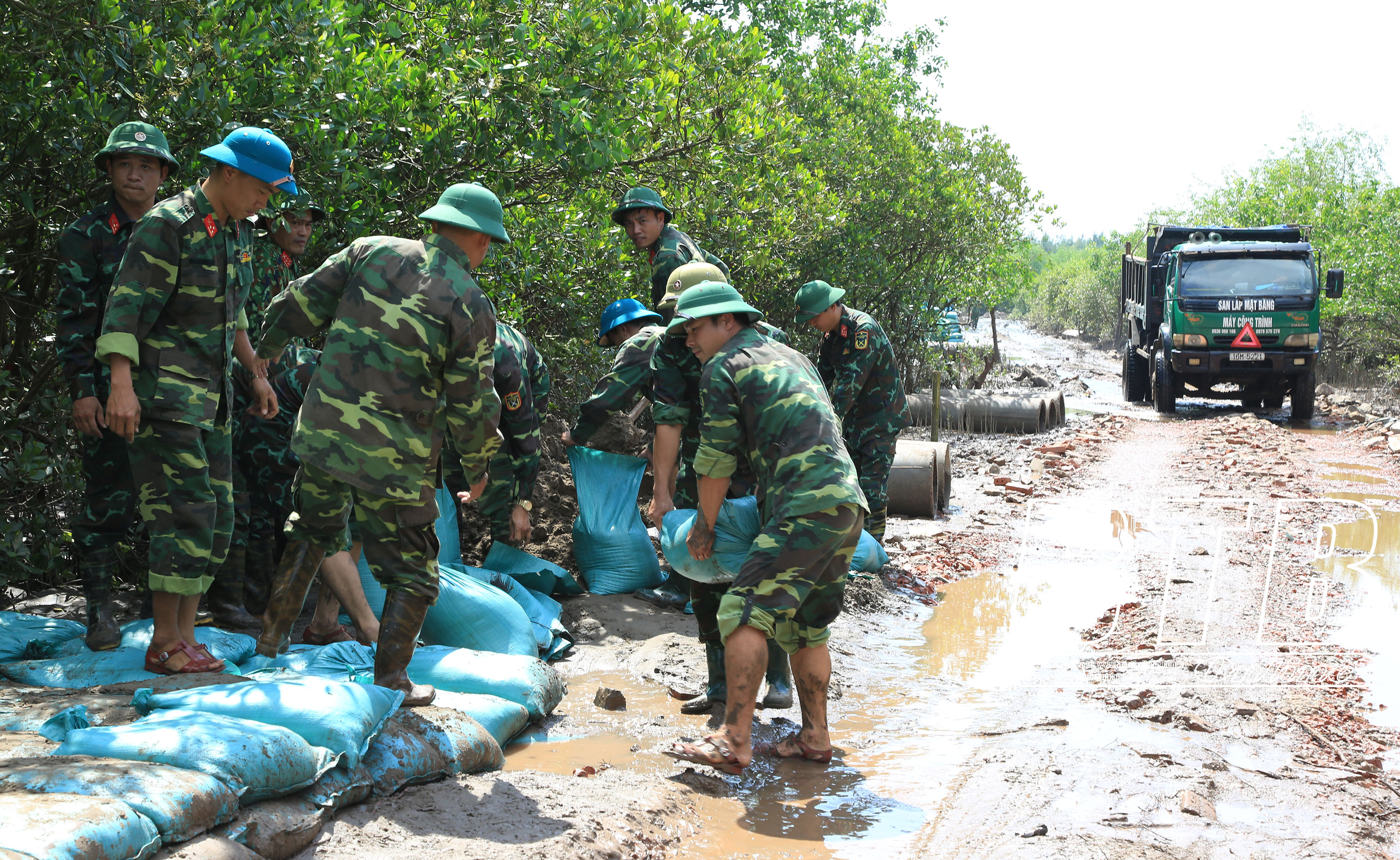 Cán bộ, chiến sĩ các đơn vị thi công các hạng mục công trình phục vụ cho diễn tập khu vực phòng thủ tỉnh.
