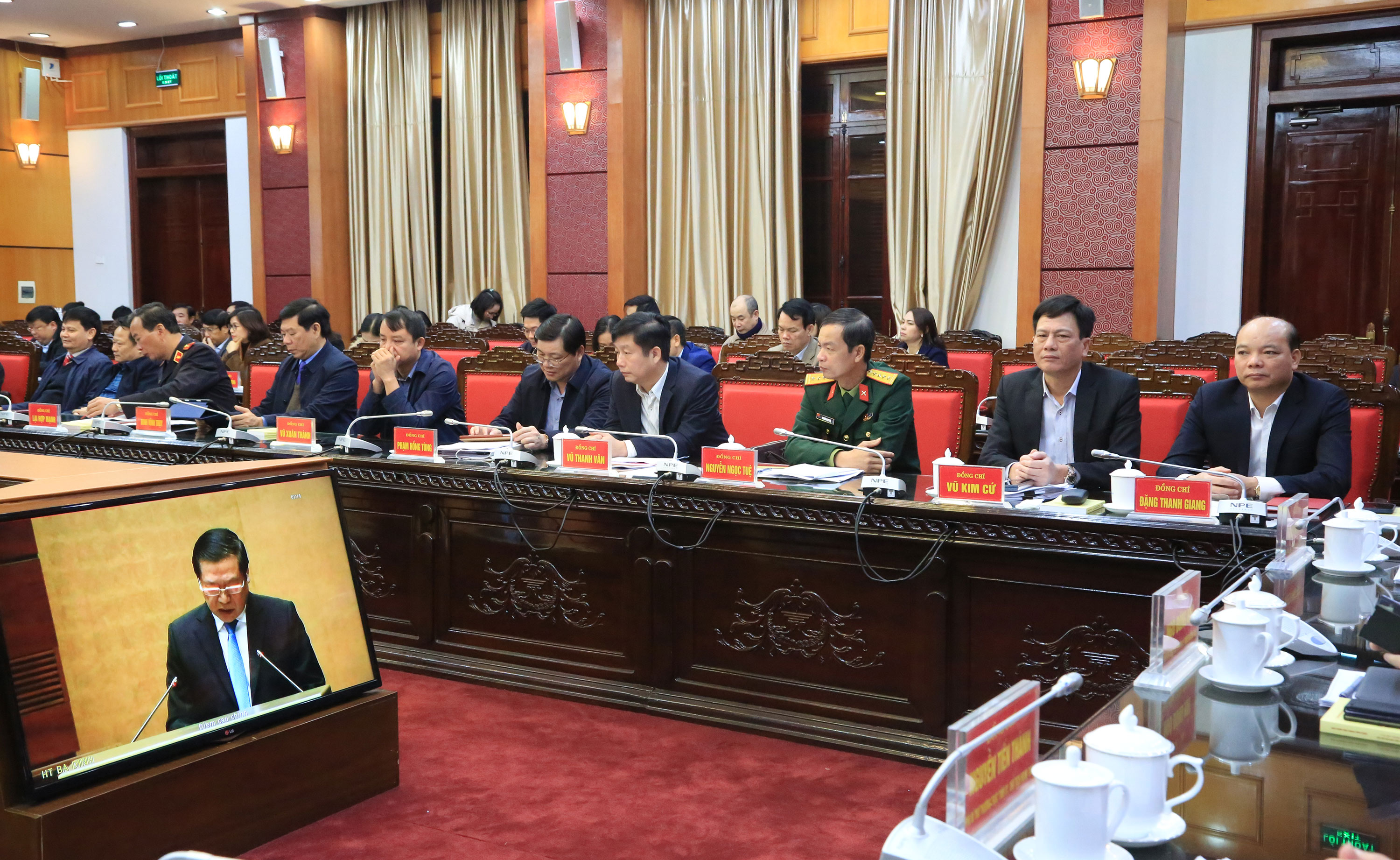 Các đồng chí: Ngô Đông Hải, Ủy viên Ban Chấp hành Trung ương Đảng, Bí thư Tỉnh ủy; Nguyễn Tiến Thành, Phó Bí thư thường trực Tỉnh ủy, Chủ tịch HĐND tỉnh; Nguyễn Khắc Thận, Phó Bí thư Tỉnh ủy, Chủ tịch UBND tỉnh dự hội nghị tại điểm cầu trụ sở Tỉnh ủy.
