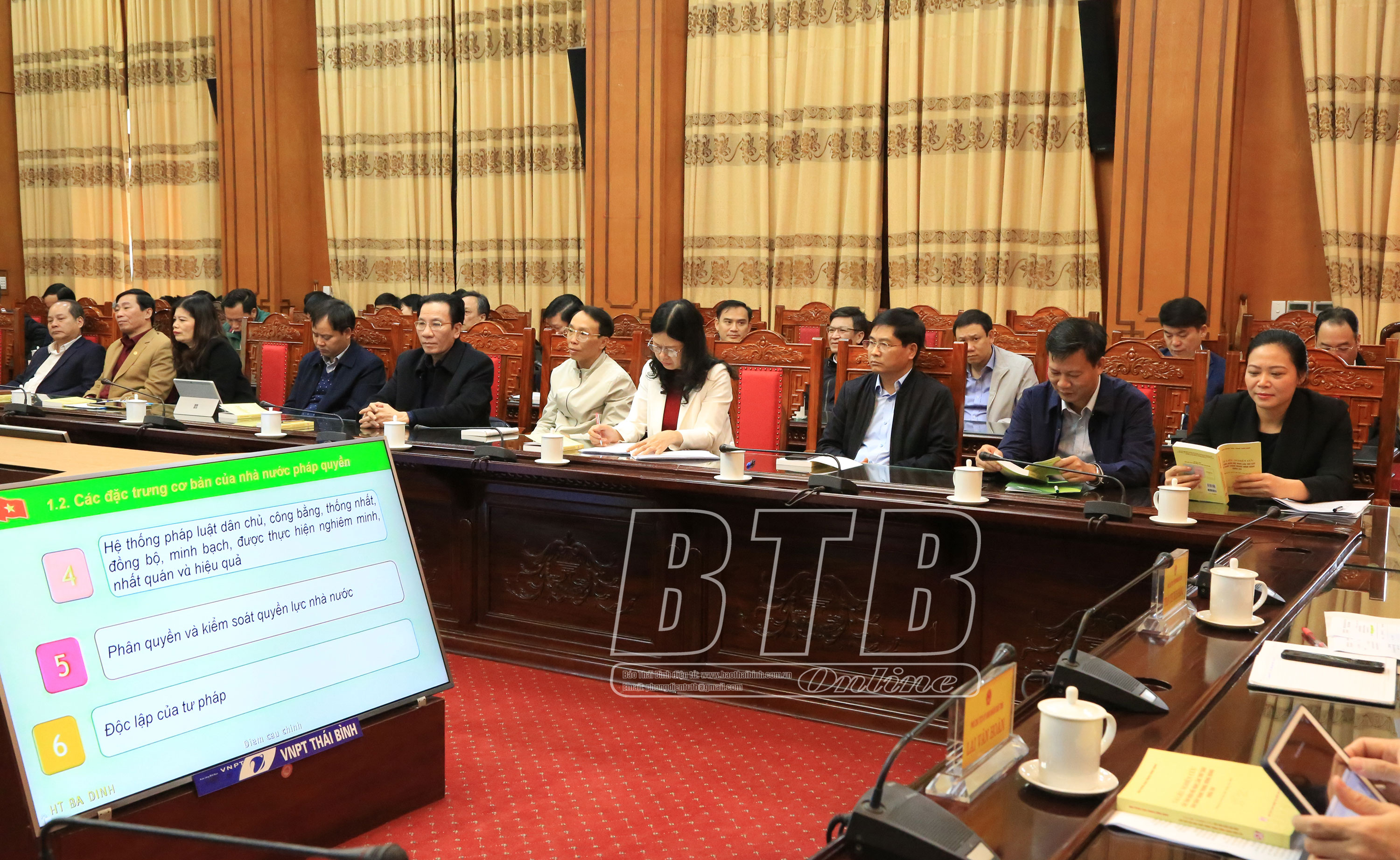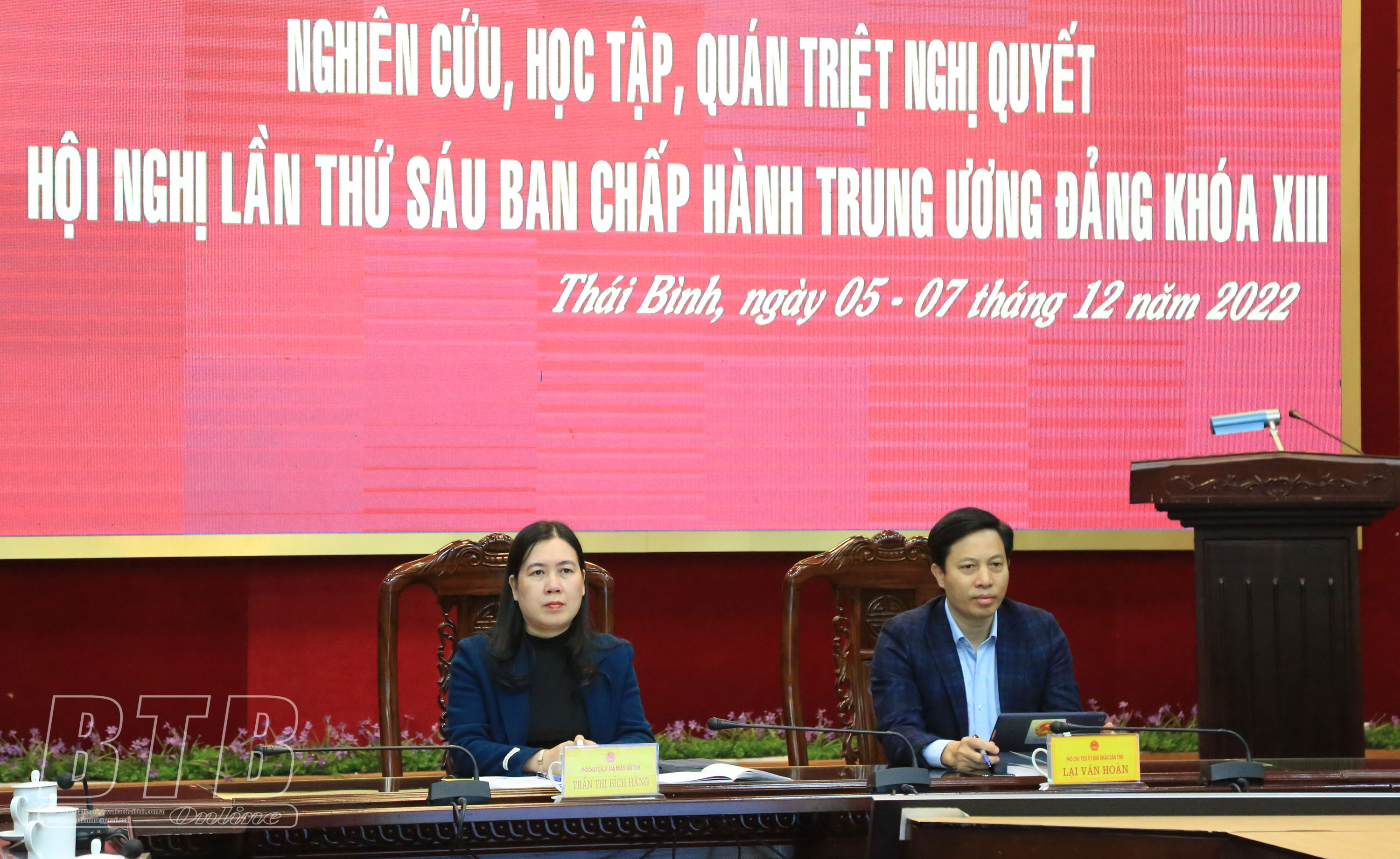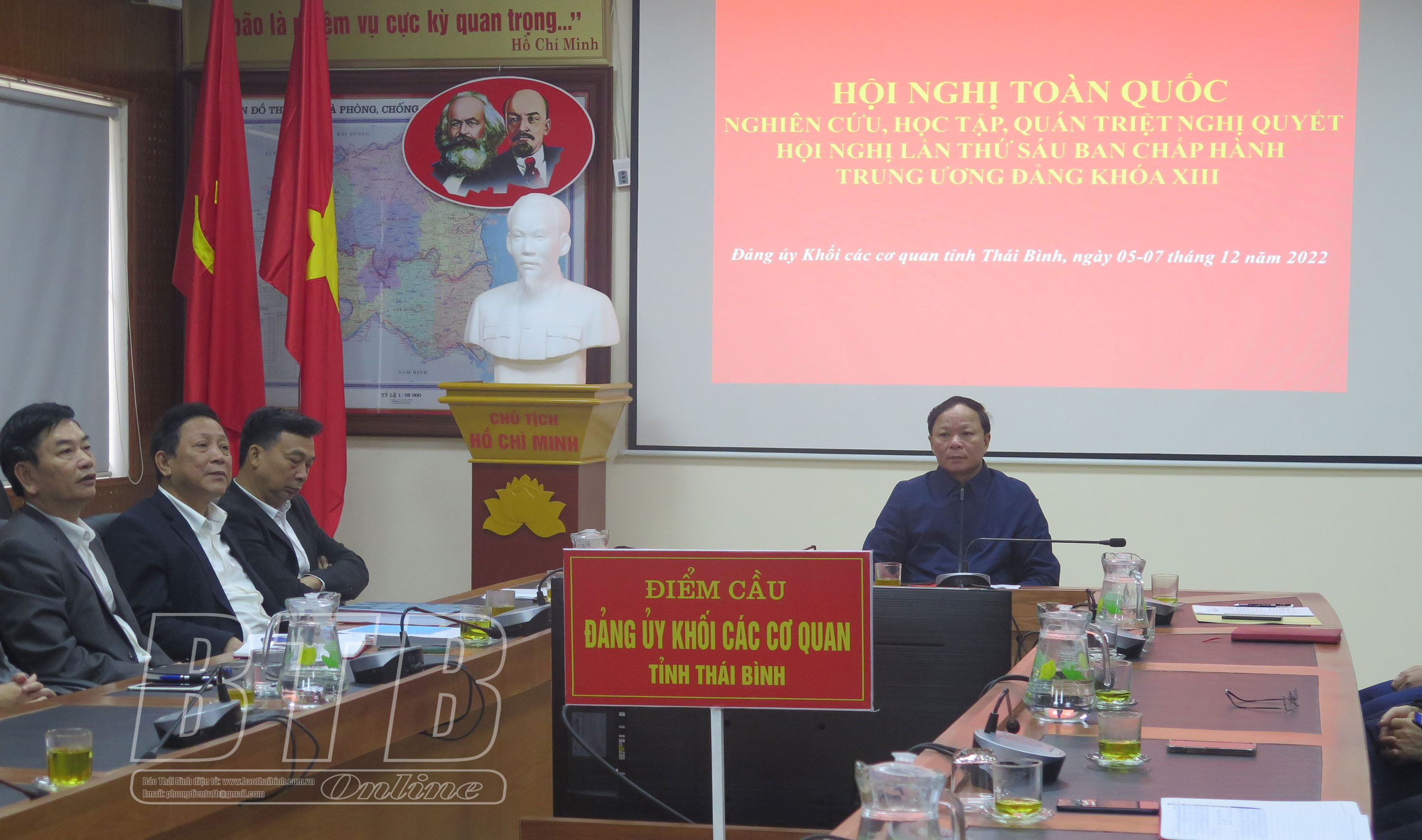 Tại Thái Bình, hội nghị được kết nối tới 191 điểm cầu trong toàn tỉnh, trong đó có 16 điểm cầu cấp tỉnh/huyện; 175 điểm cầu cấp cơ sở với trên 11.400 đại biểu tham gia nghiên cứu, học tập. Dự hội nghị tại điểm cầu trụ sở Tỉnh ủy có các đồng chí: Ngô Đông Hải, Ủy viên Ban Chấp hành Trung ương Đảng, Bí thư Tỉnh ủy; Nguyễn Tiến Thành, Phó Bí thư thường trực Tỉnh ủy, Chủ tịch HĐND tỉnh; Nguyễn Khắc Thận, Phó Bí thư Tỉnh ủy, Chủ tịch UBND tỉnh; các đồng chí Ủy viên Ban Thường vụ Tỉnh ủy; lãnh đạo các sở, ban, ngành, đoàn thể của tỉnh.