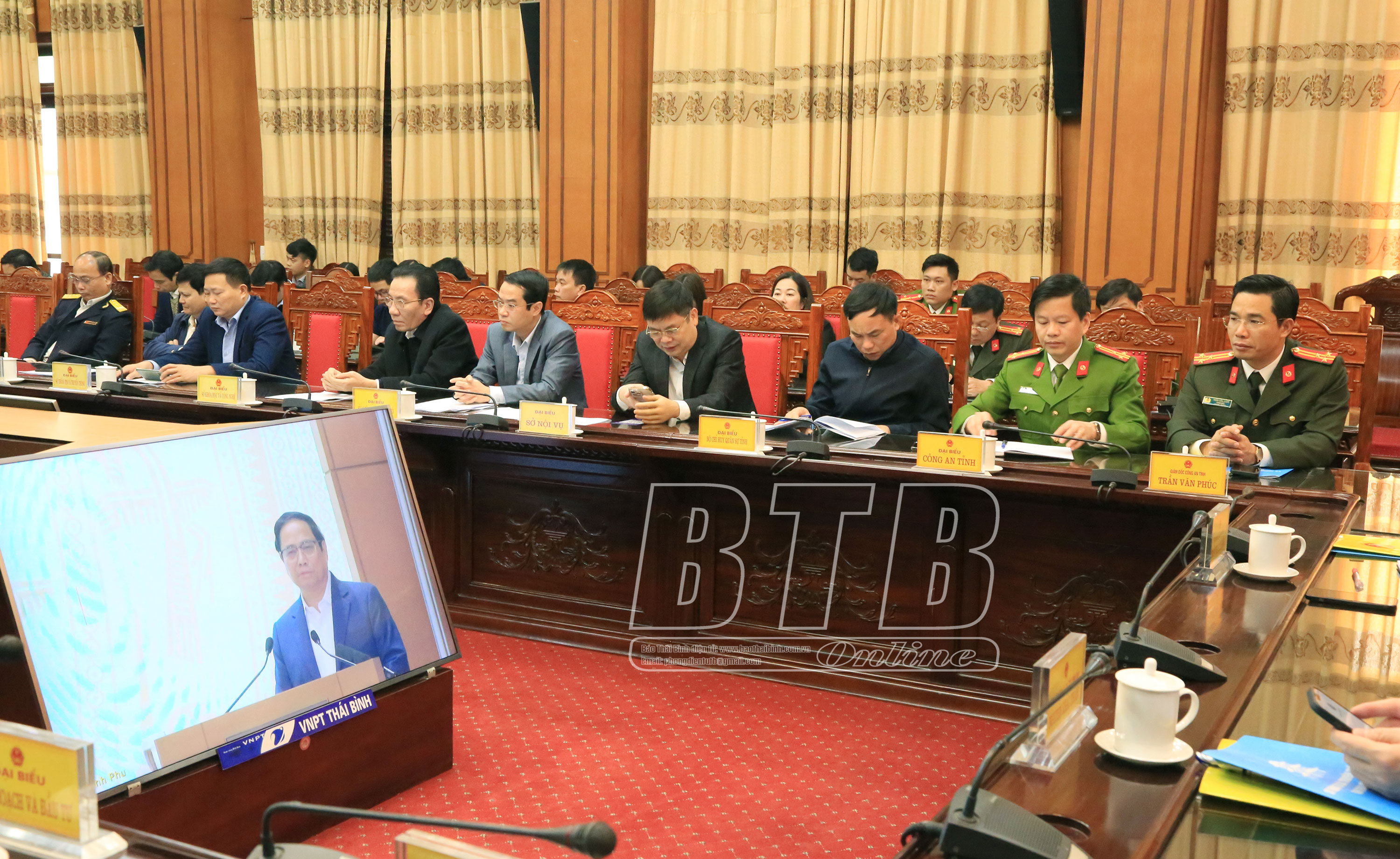 Dự hội nghị tại điểm cầu Thái Bình có các đồng chí: Nguyễn Khắc Thận, Phó Bí thư Tỉnh ủy, Chủ tịch UBND tỉnh, Tổ trưởng Tổ công tác Đề án 06 của tỉnh; Trần Văn Phúc, Ủy viên Ban Thường vụ Tỉnh ủy, Giám đốc Công an tỉnh, Tổ phó Tổ công tác Đề án 06 của tỉnh; Trần Thị Bích Hằng, Tỉnh ủy viên, Phó Chủ tịch UBND tỉnh, Tổ phó Tổ công tác Đề án 06 của tỉnh; các thành viên Tổ công tác Đề án số 06 của tỉnh.