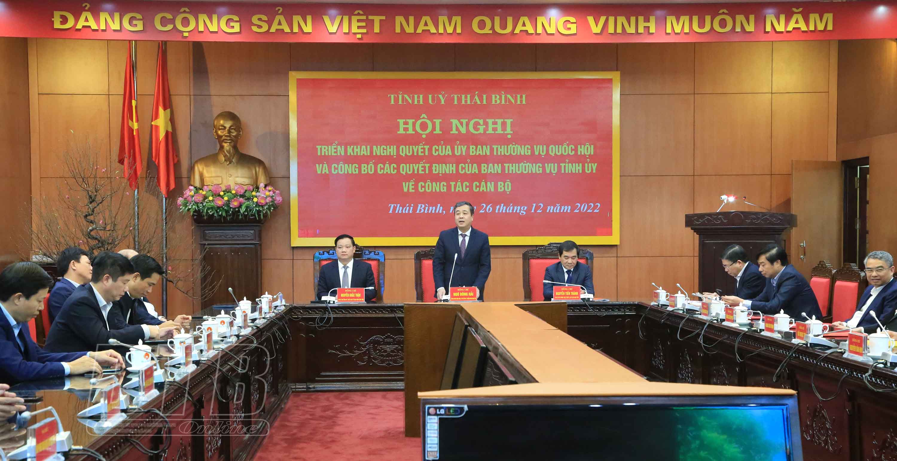 Theo đó, đồng chí Vũ Ngọc Trì, Tỉnh ủy viên, Bí thư Huyện ủy, Chủ tịch HĐND huyện Kiến Xương đến nhận công tác tại HĐND tỉnh kể từ ngày 28/12/2022, giữ chức vụ Phó Chủ tịch HĐND tỉnh, nhiệm kỳ 2021 - 2026; đồng chí Vũ Xuân Thành, Tỉnh ủy viên, Giám đốc Sở Giao thông Vận tải đến nhận công tác tại huyện Kiến Xương, chỉ định tham gia Ban Chấp hành Đảng bộ huyện, Ban Thường vụ Huyện ủy và giữ chức Bí thư Huyện ủy Kiến Xương, nhiệm kỳ 2020 - 2025; đồng chí Trần Quang Triển, Tỉnh ủy viên, Bí thư Huyện ủy Đông Hưng đến nhận công tác tại Sở Giao thông Vận tải, bổ nhiệm giữ chức vụ Giám đốc Sở Giao thông Vận tải.
