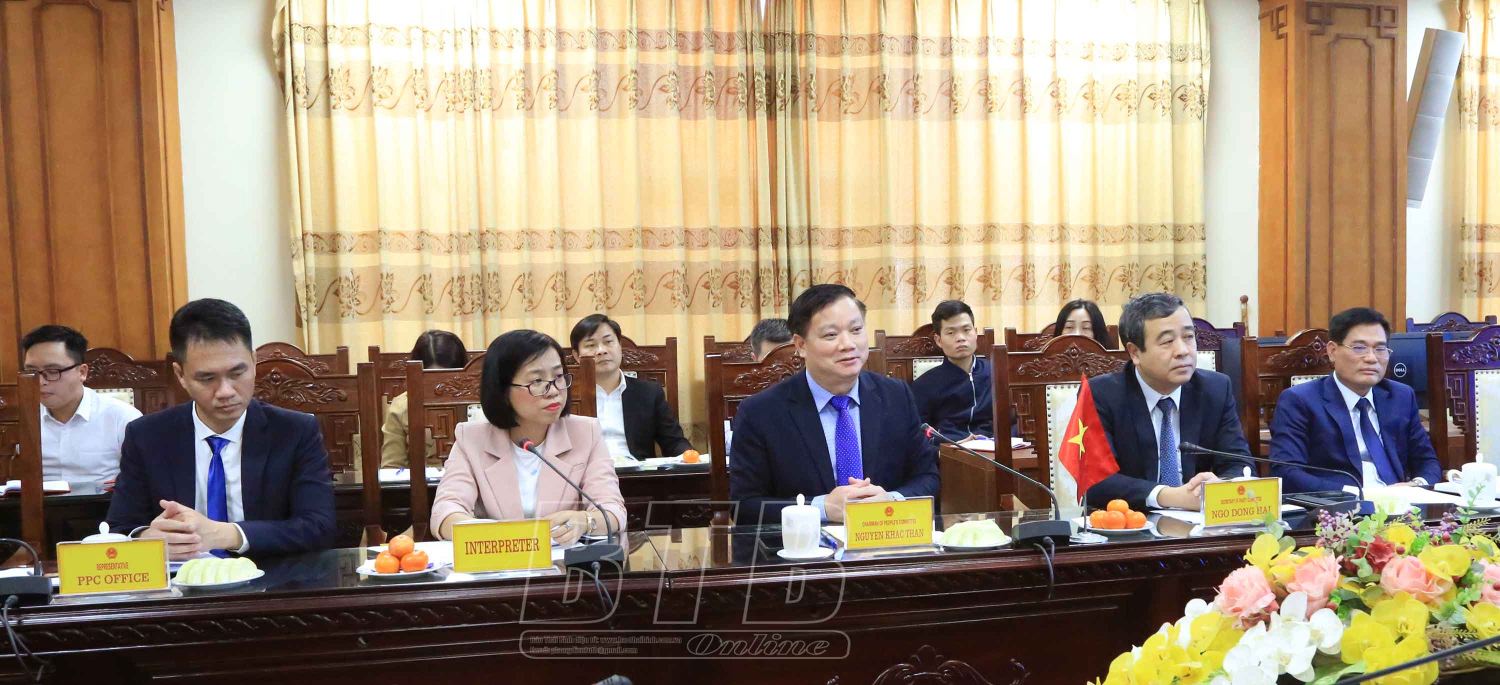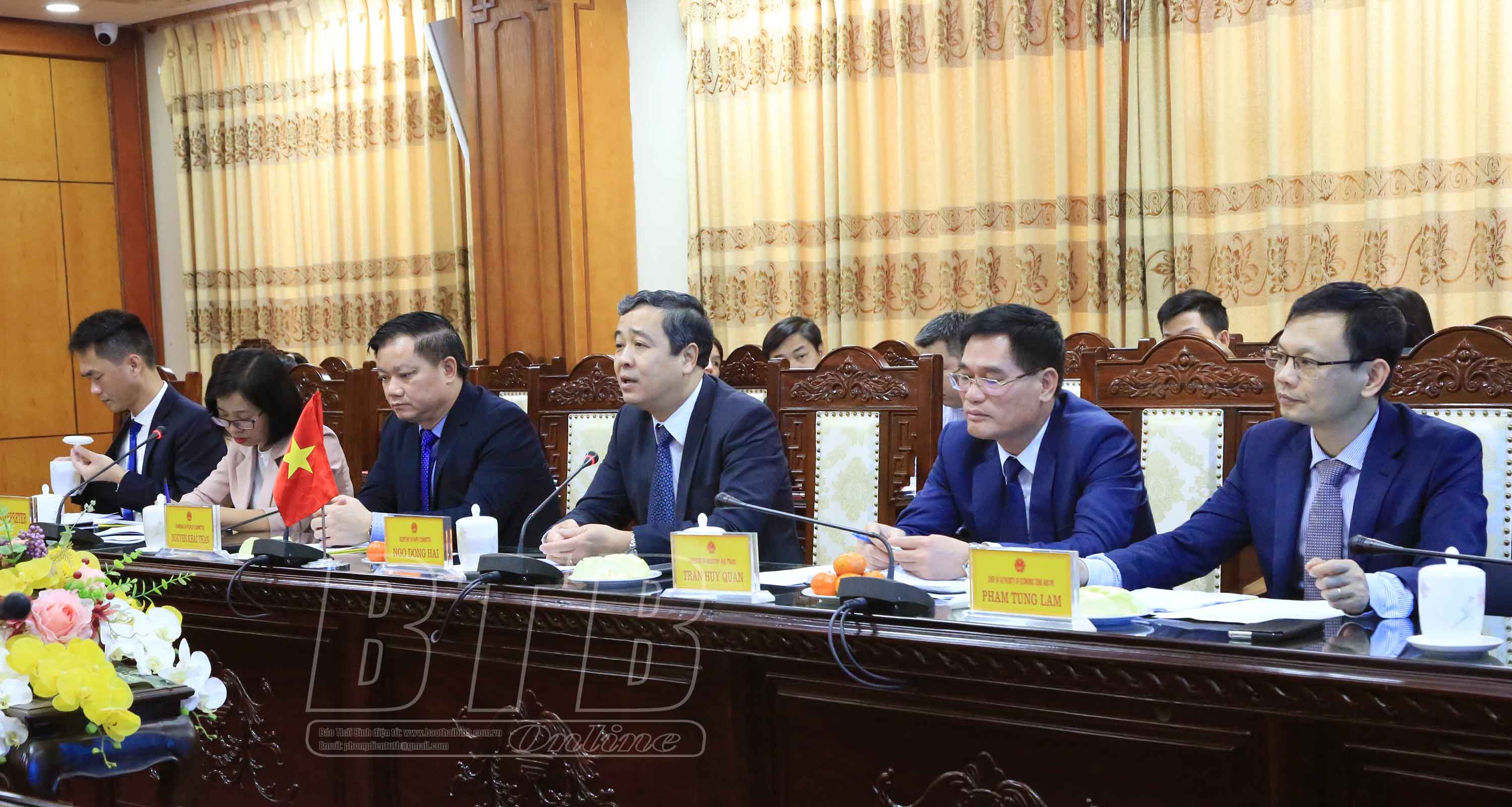 Trong bầu không khí cởi mở, thân tình, đồng chí Bí thư Tỉnh ủy đã giới thiệu một số nét nổi bật về vị trí địa lý, điều kiện tự nhiên, những tiềm năng thế mạnh phát triển kinh tế - xã hội của Thái Bình. Đồng chí Bí thư Tỉnh ủy cho biết, hiện nay tỉnh đang tập trung đẩy mạnh đầu tư hạ tầng các khu công nghiệp, cụm công nghiệp, hệ thống giao thông kết nối và thu hút đầu tư. Thái Bình đang là điểm đến hấp dẫn của các nhà đầu tư trong và ngoài nước, đã có nhiều doanh nghiệp, tập đoàn lớn trên thế giới đến nghiên cứu, hợp tác và đầu tư tại Khu kinh tế và một số khu công nghiệp.