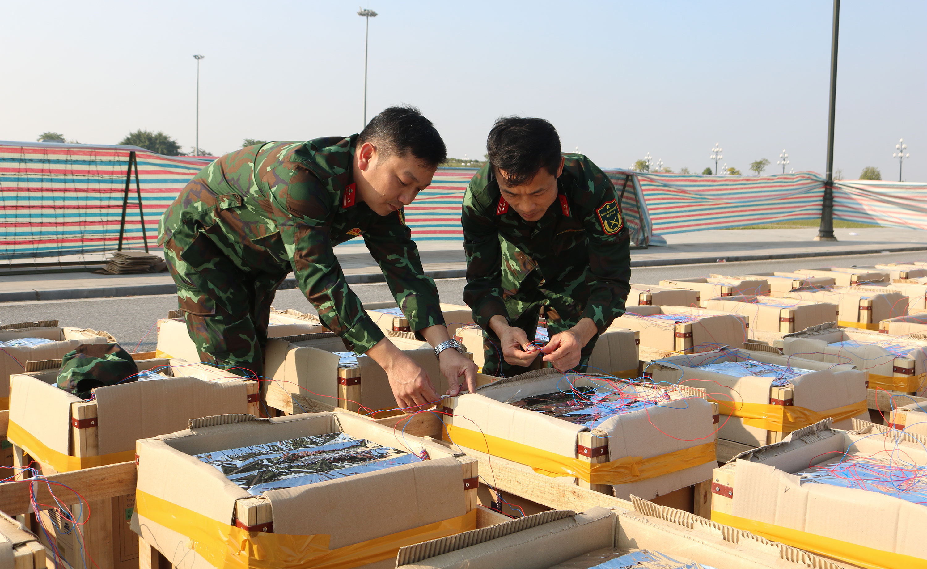 Cán bộ, chiến sĩ Bộ CHQS tỉnh đấu nối thiết bị, bảo đảm công tác bắn pháo hoa tại Quảng trường Thái Bình.