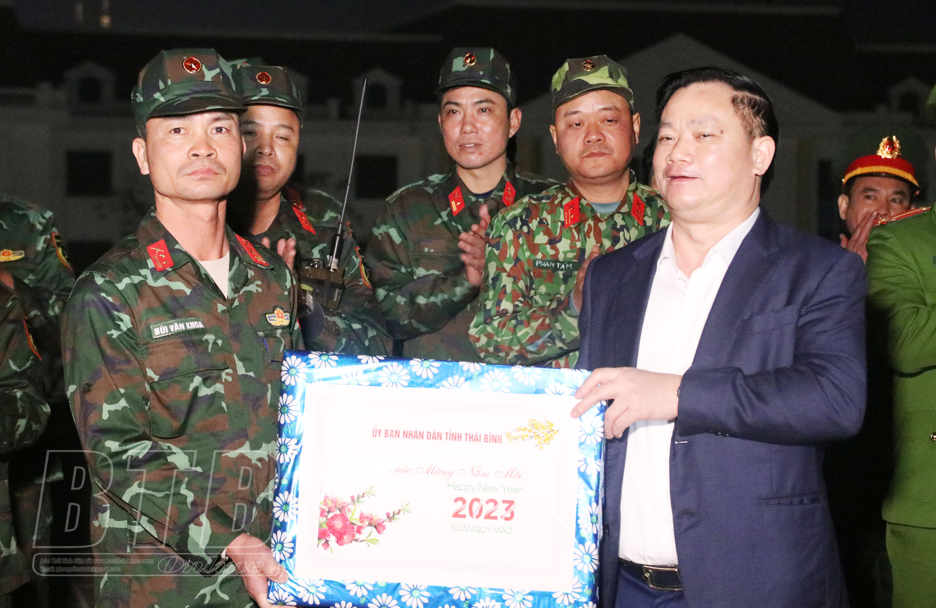 Đồng chí Nguyễn Khắc Thận, Phó Bí thư Tỉnh ủy, Chủ tịch UBND tỉnh tặng quà, chúc tết cán bộ,chiến sĩ làm nhiệm vụ tại trận địa pháo hoa Trụ sở Tỉnh ủy cũ.